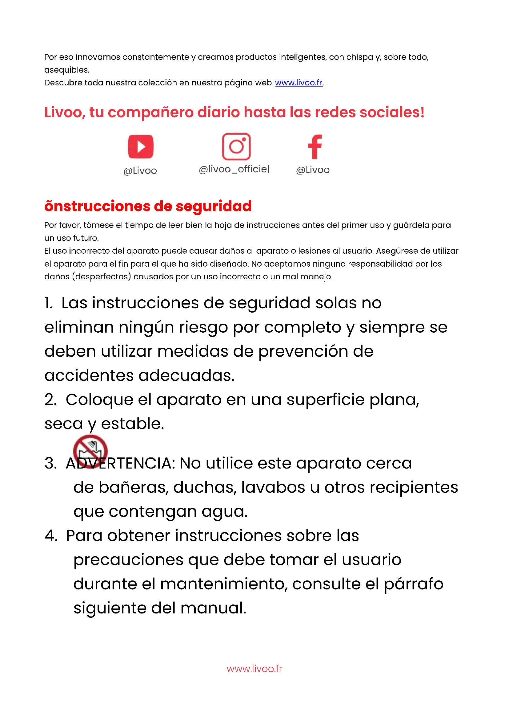 Gracias por haber elegido un producto Livoo! Su batidora, su barbacoa, sus auriculares no son simples objetos, son una extensión de usted que le permite conectar con su gente, reunirla, reír e interactuar. El objetivo de Livoo es ayudarle a vivir su vida a tope sean cuales sean sus gustos a lo largo del año. Raclette en invierno, barbacoa en verano. O al revés. Usted decide. Aproveche esta libertad para disfrutar de momentos de bienestar en su vida diaria. ESwww.livoo.fr Por eso innovamos constantemente y creamos productos inteligentes, con chispa y, sobre todo, asequibles. Descubre toda nuestra colección en nuestra página web www.livoo.fr. Livoo, tu compañero diario hasta las redes sociales!
