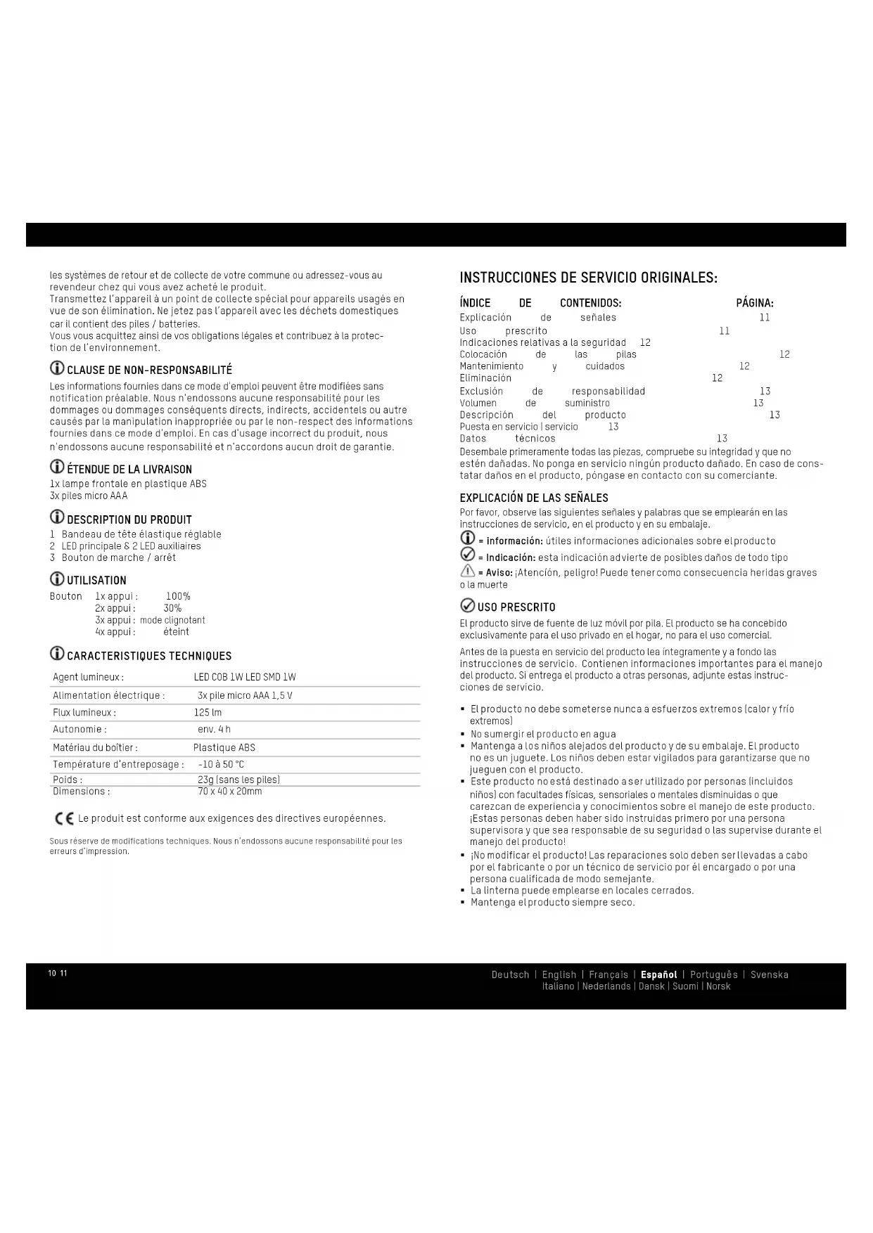 Las informaciones contenidas en este manual de instrucciones se pueden modificar sin aviso previo. No aceptamos ninguna responsabilidad por los daños directos, indirectos, casuales o de otro tipo ni por los daños resultantes que se originen por una manipulación inapropiada o por no tener en cuenta las informaciones contenidas en estas instrucciones de uso. En el caso de usar erróneamente el producto no nos responsabilizamos de ningún modo ni acepta- mos reivindicaciones en concepto de garantía. CONTENIDO DEL PRODUCTO: Una lámpara frontal de material sintético ABS 3 pilas micro AAA