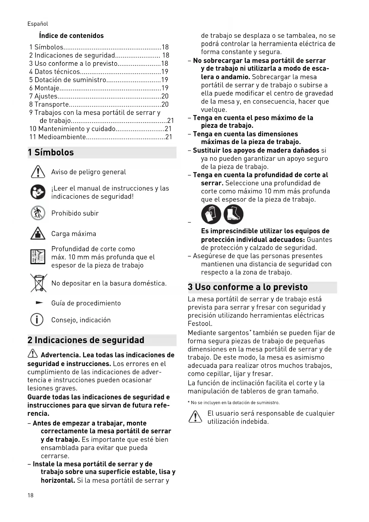 - 11 Medioambiente 1 Símbolos Aviso de peligro general ¡Leer el manual de instrucciones y las indicaciones de seguridad! Prohibido subir Carga máxima max. 10 mm Profundidad de corte como máx. 10 mm más profunda que el espesor de la pieza de trabajo No depositar en la basura doméstica. Guía de procedimiento Consejo, indicación 2 Indicaciones de seguridad Advertencia. Lea todas las indicaciones de seguridad e instrucciones. Los errores en el cumplimiento de las indicaciones de adver tencia e instrucciones pueden ocasionar lesiones graves. Guarde todas las indicaciones de seguridad e instrucciones para que sirvan de futura refe rencia. – Antes de empezar a trabajar, monte correctamente la mesa portátil de serrar y de trabajo. Es importante que esté bien ensamblada para evitar que pueda cerrarse. – Instale la mesa portátil de serrar y de trabajo sobre una superficie estable, lisa y horizontal. Si la mesa portátil de serrar y de trabajo se desplaza o se tambalea, no se podrá controlar la herramienta eléctrica de forma constante y segura. – No sobrecargar la mesa portátil de serrar y de trabajo ni utilizarla a modo de esca lera o andamio. Sobrecargar la mesa portátil de serrar y de trabajo o subirse a ella puede modificar el centro de gravedad de la mesa y, en consecuencia, hacer que vuelque. – Tenga en cuenta el peso máximo de la pieza de trabajo. – Tenga en cuenta las dimensiones máximas de la pieza de trabajo. – Sustituir los apoyos de madera dañados si ya no pueden garantizar un apoyo seguro de la pieza de trabajo. – Tenga en cuenta la profundidad de corte al serrar. Seleccione una profundidad de corte como máximo 10 mm más profunda que el espesor de la pieza de trabajo. p. 21