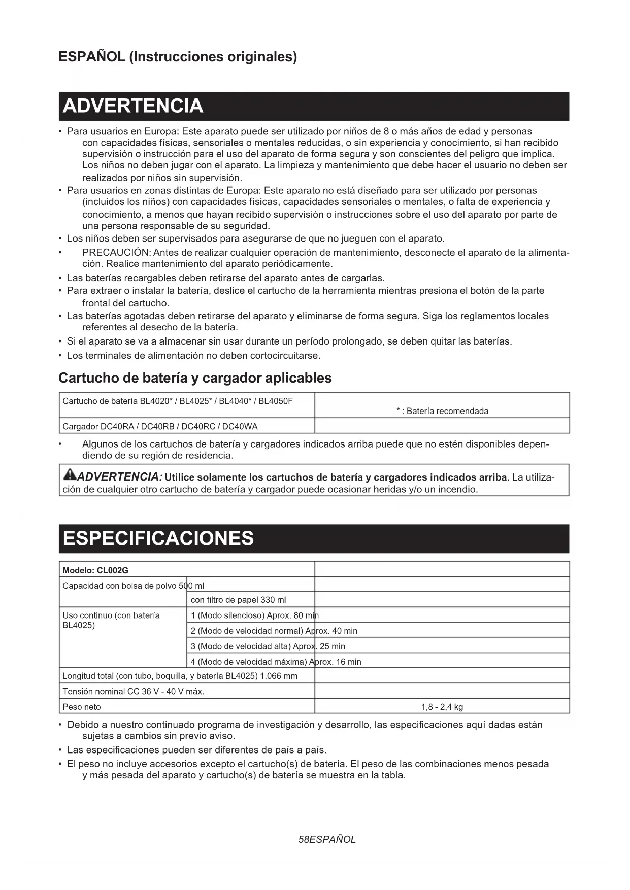 - Algunos de los cartuchos de batería y cargadores indicados arriba puede que no estén disponibles depen- diendo de su región de residencia. ADVERTENCIA: Utilice solamente los cartuchos de batería y cargadores indicados arriba. La utiliza- ción de cualquier otro cartucho de batería y cargador puede ocasionar heridas y/o un incendio. ESPECIFICACIONES Modelo: CL002G Capacidad con bolsa de polvo 500 ml con ltro de papel 330 ml Uso continuo (con batería BL4025) 1 (Modo silencioso) Aprox. 80 min 2 (Modo de velocidad normal) Aprox. 40 min 3 (Modo de velocidad alta) Aprox. 25 min 4 (Modo de velocidad máxima) Aprox. 16 min Longitud total (con tubo, boquilla, y batería BL4025) 1.066 mm Tensión nominal CC 36 V - 40 V máx. Peso neto 1,8 - 2,4 kg