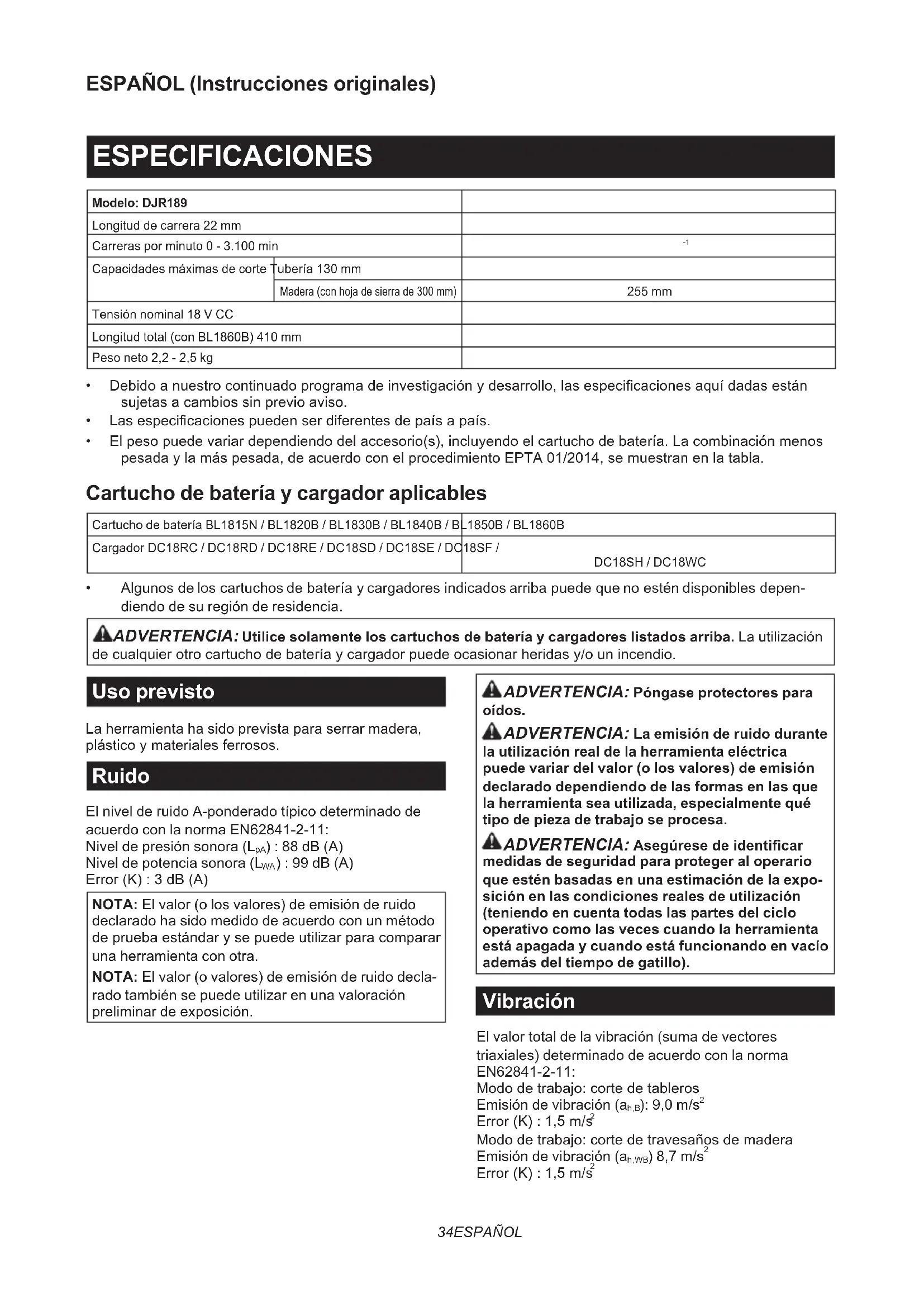 - Algunosdeloscartuchosdebateríaycargadoresindicadosarribapuedequenoesténdisponiblesdepen- diendo de su región de residencia. ADVERTENCIA: Utilice solamente los cartuchos de batería y cargadores listados arriba. La utilización decualquierotrocartuchodebateríaycargadorpuedeocasionarheridasy/ounincendio. Uso previsto La herramienta ha sido prevista para serrar madera, plásticoymaterialesferrosos. Ruido El nivel de ruido A-ponderado típico determinado de acuerdo con la norma EN62841-2-11: Nivel de presión sonora (L