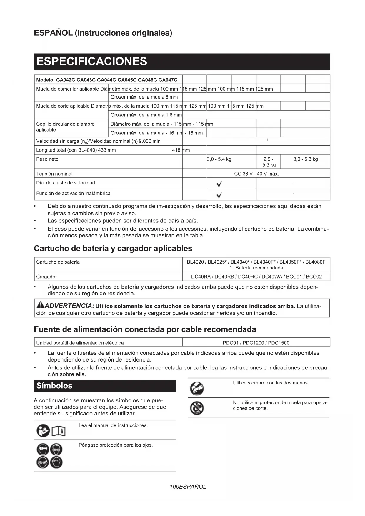 - Antes de utilizar la fuente de alimentación conectada por cable, lea las instrucciones e indicaciones de precau- ción sobre ella. Símbolos A continuación se muestran los símbolos que pue- den ser utilizados para el equipo. Asegúrese de que entiende su signicado antes de utilizar. Lea el manual de instrucciones. Póngase protección para los ojos. Utilice siempre con las dos manos. No utilice el protector de muela para opera- ciones de corte.101 ESPAÑOL Ni-MH Li-ion Sólo para países de la Unión Europea Debido a la presencia de componentes peligrosos en el equipo, el equipo eléctrico y electrónico, los acumuladores y las baterías desechados pueden tener un impacto negativo para el medioambiente y la salud humana. ¡No tire los aparatos eléctricos y electróni- cos ni las baterías junto con los residuos domésticos! De conformidad con las Directivas Europeas sobre residuos de aparatos eléctricos y electrónicos y sobre acumu- ladores y baterías y residuos de acumula- dores y baterías, así como la adaptación de las mismas a la ley nacional, el equipo eléctrico, las baterías y los acumuladores desechados deberán ser almacenados por separado y trasladados a un punto distinto de recogida de desechos municipales, que cumpla con los reglamentos sobre protec- ción medioambiental. Esto se indica mediante el símbolo de cubo de basura tachado colocado en el equipo. Uso previsto La herramienta ha sido prevista para esmerilar, lijar, cepillar con alambres y cortar metales y materiales de piedra sin utilizar agua. Ruido El nivel de ruido A-ponderado típico determinado de acuerdo con la norma EN62841-2-3: Modelo Nivel de presión del sonido