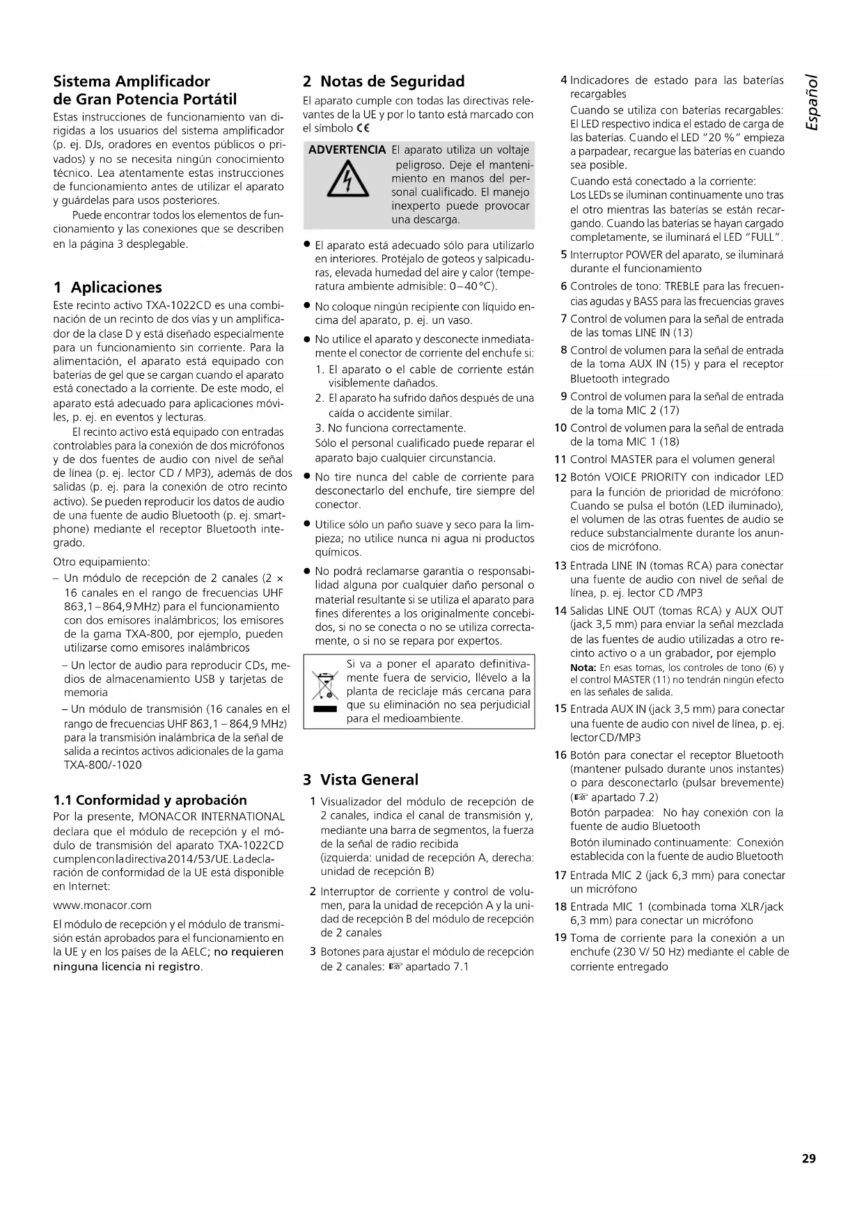 EspañolEspañol PáginaContenidos Sistema Amplificador de Gran Potencia Portátil Estas instrucciones de funcionamiento van di-rigidas a los usuarios del sistema amplificador (p. ej.DJs, oradores en eventos públicos o pri-vados) y no se necesita ningún conocimiento técnico. Lea atentamente estas instrucciones de funcionamiento antes de utilizar el aparato y guárdelas para usos posteriores.Puede encontrar todos los elementos de fun-cionamiento y las conexiones que se describen en la página 3 desplegable. 1 Aplicaciones Este recinto activo TXA-1022CD es una combi-nación de un recinto de dos vías y un amplifica-dor de la clase D y está diseñado especialmente para un funcionamiento sin corriente. Para la alimentación, el aparato está equipado con baterías de gel que se cargan cuando el aparato está conectado a la corriente. De este modo, el aparato está adecuado para aplicaciones móvi-les, p. ej. en eventos y lecturas.El recinto activo está equipado con entradas controlables para la conexión de dos micrófonos y de dos fuentes de audio con nivel de señal de línea (p. ej. lector CD / MP3), además de dos salidas (p. ej. para la conexión de otro recinto activo). Se pueden reproducir los datos de audio de una fuente de audio Bluetooth (p. ej. smart- phone) mediante el receptor Bluetooth inte-grado.Otro equipamiento: Un módulo de recepción de 2 canales (2 × 16 canales en el rango de frecuencias UHF 863,1 – 864,9 MHz) para el funcionamiento con dos emisores inalámbricos; los emisores de la gama TXA-800, por ejemplo, pueden utilizarse como emisores inalámbricos – Un lector de audio para reproducir CDs, me-dios de almacenamiento USB y tarjetas de memoria – Un módulo de transmisión (16 canales en el rango de frecuencias UHF 863,1 – 864,9 MHz) para la transmisión inalámbrica de la señal de salida a recintos activos adicionales de la gama TXA-800 / -1020