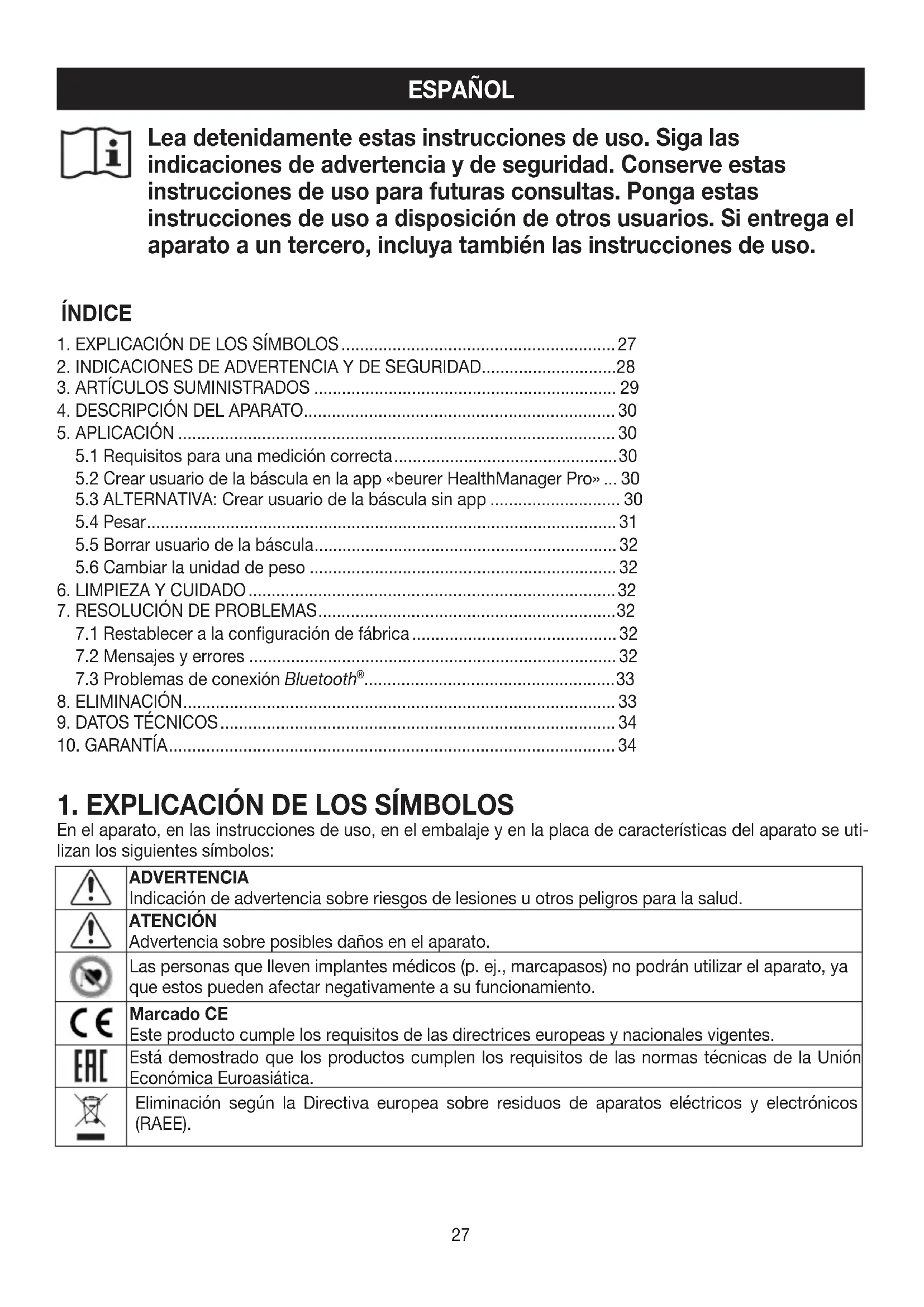 Pour plus d’informations sur la garantie et les conditions de garantie, veuillez consulter la fiche de garantie fournie. Sous réserve d’erreurs et de modifications27 ESPAÑOL Lea detenidamente estas instrucciones de uso. Siga las indicaciones de advertencia y de seguridad. Conserve estas instrucciones de uso para futuras consultas. Ponga estas instrucciones de uso a disposición de otros usuarios. Si entrega el aparato a un tercero, incluya también las instrucciones de uso.