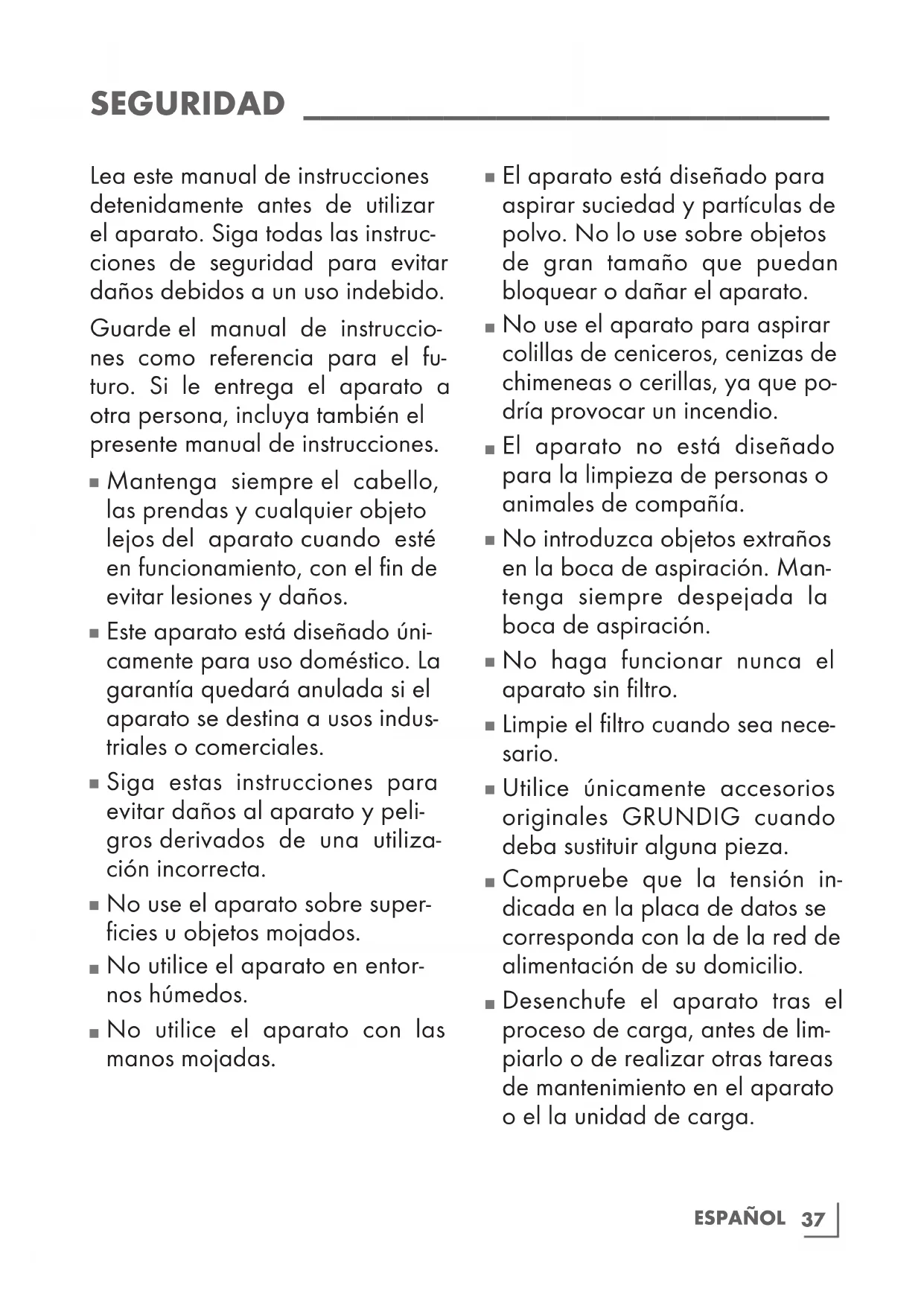 Bu bölümü, ürünü aldığınız Yetkili Satıcı imzalayacak ve kaşeleyecektir.37 ESPAÑOL SEGURIDAD ______________________________ Lea este manual de instrucciones detenidamente antes de utilizar el aparato. Siga todas las instruc- ciones de seguridad para evitar daños debidos a un uso indebido. Guarde el manual de instruccio- nes como referencia para el fu- turo. Si le entrega el aparato a otra persona, incluya también el presente manual de instrucciones.