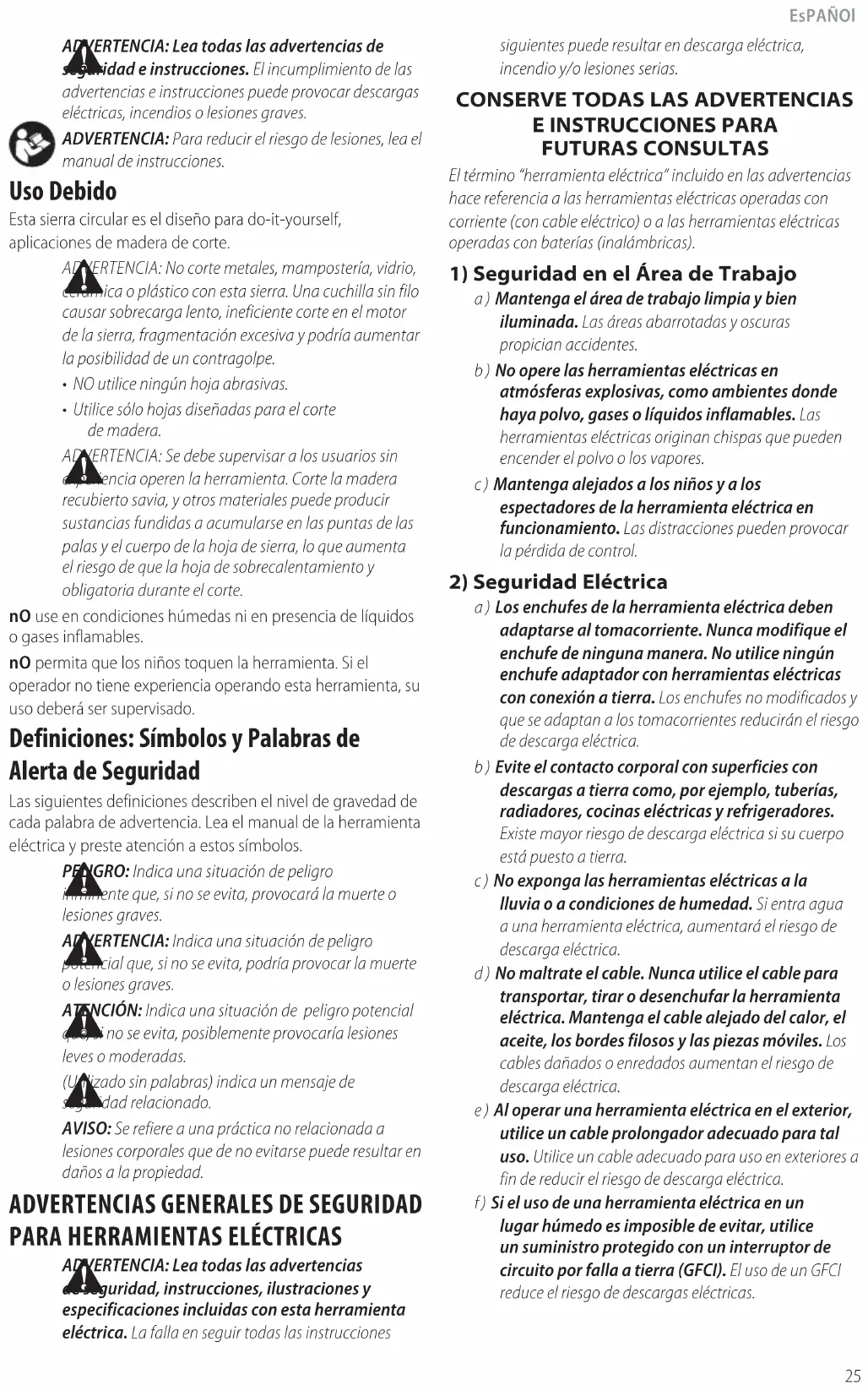 (Utilizado sin palabras) indica un mensaje de seguridadrelacionado. AVISO: Se refiere a una práctica no relacionada a lesiones corporales que de no evitarse puede resultar en daños a lapropiedad. Uso Debido Esta sierra circular es el diseño para do‑it‑yourself, aplicaciones de madera decorte.