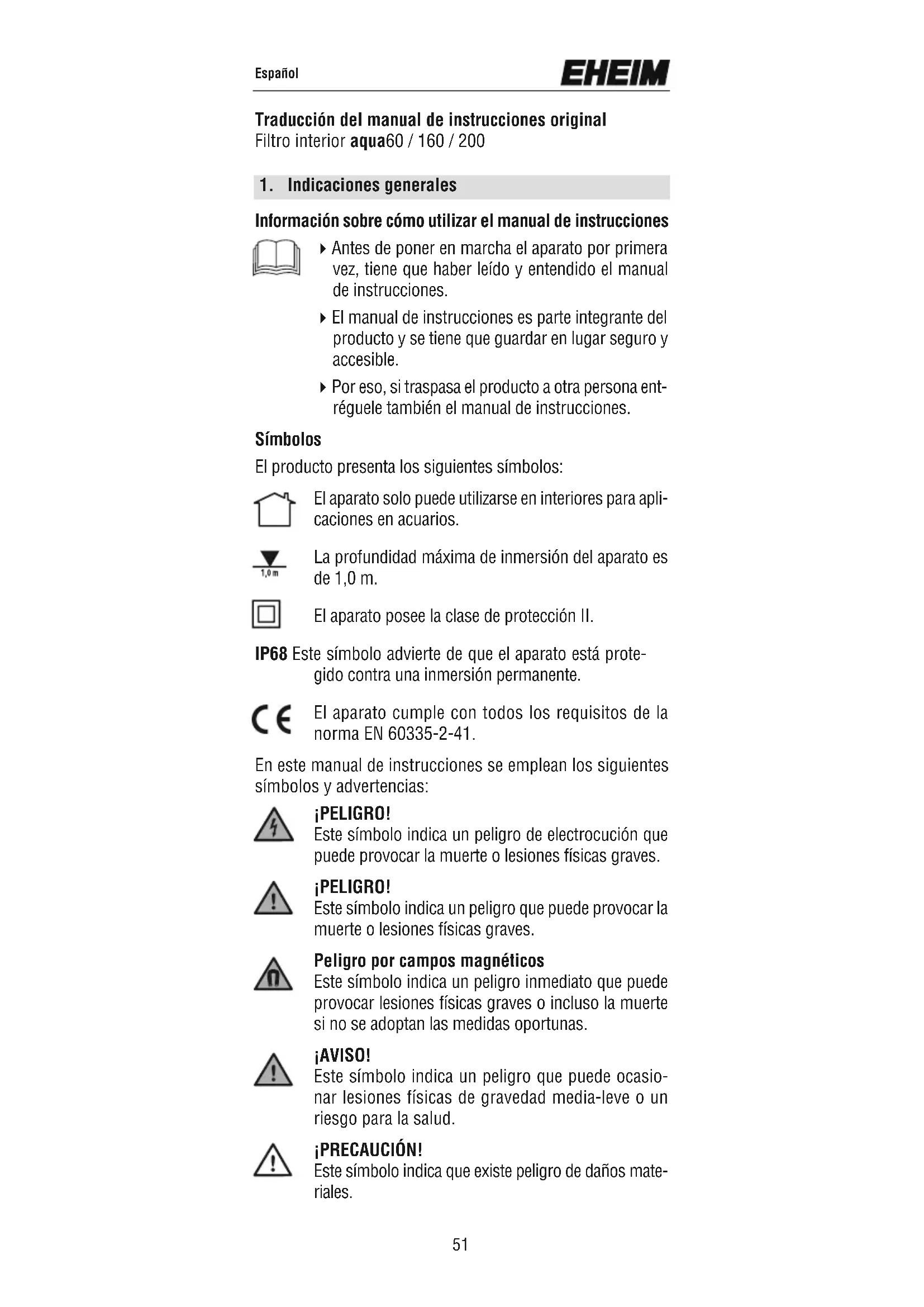 Información sobre cómo utilizar el manual de instrucciones 4Antes de poner en marcha el aparato por primera vez, tiene que haber leído y entendido el manual de instrucciones. 4El manual de instrucciones es parte integrante del producto y se tiene que guardar en lugar seguro y accesible. 4Por eso, si traspasa el producto a otra persona ent- réguele también el manual de instrucciones. Símbolos El producto presenta los siguientes símbolos: El aparato solo puede utilizarse en interiores para apli- caciones en acuarios. La profundidad máxima de inmersión del aparato es de 1,0 m. El aparato posee la clase de protección II. IP68 Este símbolo advierte de que el aparato está prote- gido contra una inmersión permanente. El aparato cumple con todos los requisitos de la norma EN 60335-2-41. En este manual de instrucciones se emplean los siguientes símbolos y advertencias: ¡PELIGRO! Este símbolo indica un peligro de electrocución que puede provocar la muerte o lesiones físicas graves. ¡PELIGRO! Este símbolo indica un peligro que puede provocar la muerte o lesiones físicas graves. Peligro por campos magnéticos Este símbolo indica un peligro inmediato que puede provocar lesiones físicas graves o incluso la muerte si no se adoptan las medidas oportunas. ¡AVISO! Este símbolo indica un peligro que puede ocasio- nar lesiones físicas de gravedad media-leve o un riesgo para la salud. ¡PRECAUCIÓN! Este símbolo indica que existe peligro de daños mate- riales. Traducción del manual de instrucciones original Filtro interior aqua60 / 160 / 200 Español 51Español Este símbolo señala información y recomendacio- nes útiles. Presentación de las indicaciones: A Este símbolo remite a figuras, aquí la Figura A. Este símbolo insta a realizar una acción.