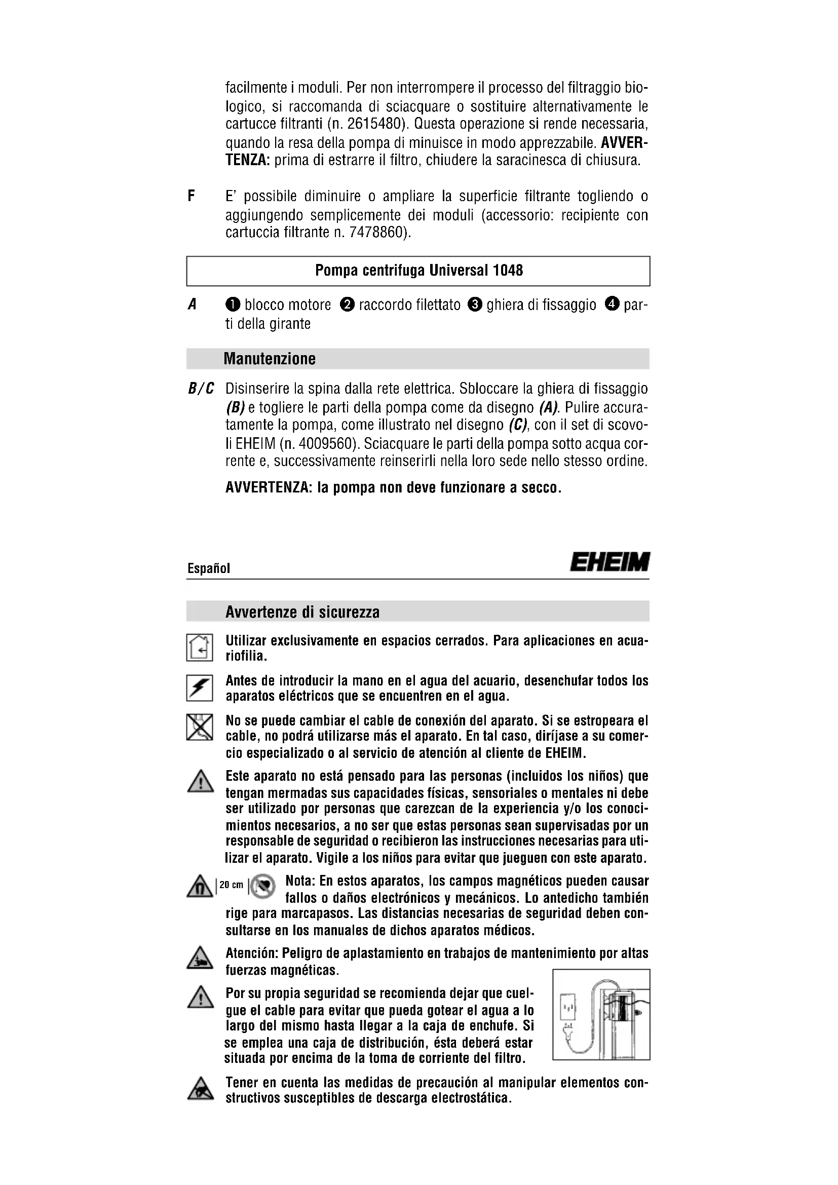 par- ti della girante B / C Disinserire la spina dalla rete elettrica. Sbloccare la ghiera di fissaggio (B) e togliere le parti della pompa come da disegno (A). Pulire accura- tamente la pompa, come illustrato nel disegno (C), con il set di scovo- li EHEIM (n. 4009560). Sciacquare le parti della pompa sotto acqua cor- rente e, successivamente reinserirli nella loro sede nello stesso ordine. AVVERTENZA: la pompa non deve funzionare a secco. Pompa centrifuga Universal 1048 Manutenzione Avvertenze di sicurezza Utilizar exclusivamente en espacios cerrados. Para aplicaciones en acua- riofilia. Antes de introducir la mano en el agua del acuario, desenchufar todos los aparatos eléctricos que se encuentren en el agua. No se puede cambiar el cable de conexión del aparato. Si se estropeara el cable, no podrá utilizarse más el aparato. En tal caso, diríjase a su comer- cio especializado o al servicio de atención al cliente de EHEIM. Este aparato no está pensado para las personas (incluidos los niños) que tengan mermadas sus capacidades físicas, sensoriales o mentales ni debe ser utilizado por personas que carezcan de la experiencia y/o los conoci- mientos necesarios, a no ser que estas personas sean supervisadas por un responsable de seguridad o recibieron las instrucciones necesarias para uti- lizar el aparato. Vigile a los niños para evitar que jueguen con este aparato. Nota: En estos aparatos, los campos magnéticos pueden causar fallos o daños electrónicos y mecánicos. Lo antedicho también rige para marcapasos. Las distancias necesarias de seguridad deben con- sultarse en los manuales de dichos aparatos médicos. Atención: Peligro de aplastamiento en trabajos de mantenimiento por altas fuerzas magnéticas. Por su propia seguridad se recomienda dejar que cuel- gue el cable para evitar que pueda gotear el agua a lo largo del mismo hasta llegar a la caja de enchufe. Si se emplea una caja de distribución, ésta deberá estar situada por encima de la toma de corriente del filtro. Tener en cuenta las medidas de precaución al manipular elementos con- structivos susceptibles de descarga electrostática. 20 cm EspañolNo limpiar el aparato ni sus componentes en un lavavajillas. ¡No es re- sistente al lavavajillas! No tire este producto a la basura doméstica normal. Llévelo a su punto lo- cal de eliminación de residuos. El producto está aprobado según las prescripciones y directrices nacionales de cada país y cumple las normas de la EU. Filtro interior 2048 Acabado: véase placa de características en la carcasa de la bomba