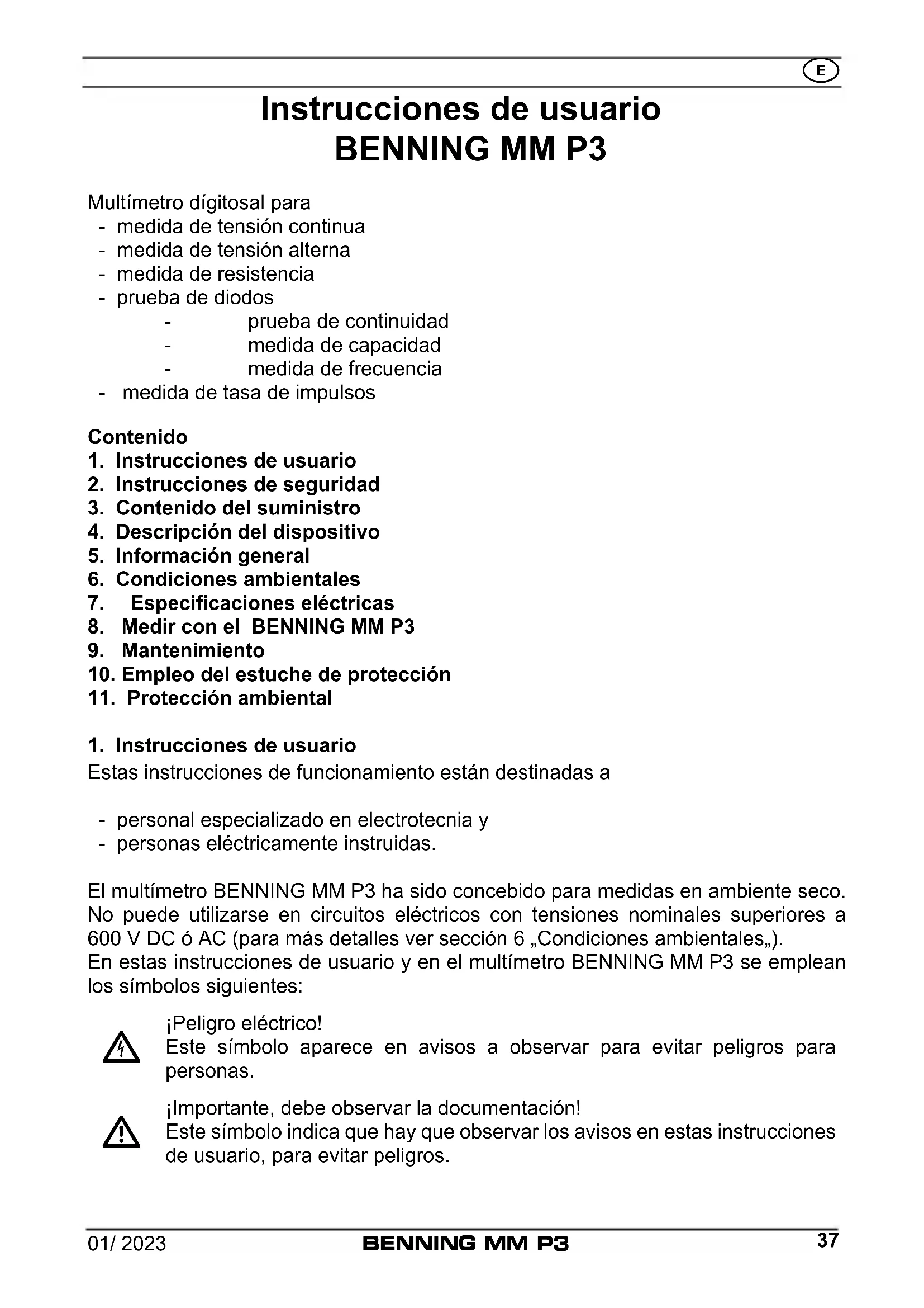 Los medidores deben ser utilizados en circuitos eléctricos de sob- retensión de categoría II con un conductor a tierra de 600 V, o de la categoría de sobretensión III con conductor a tierra 300 V. Tenga en cuenta que cualquier trabajo en partes e instalaciones bajo tensión eléctrica son en principio peligrosos. Incluso ten- siones bajas de 30 V AC y 60 V DC pueden ser peligrosas para las personas.01/ 2023