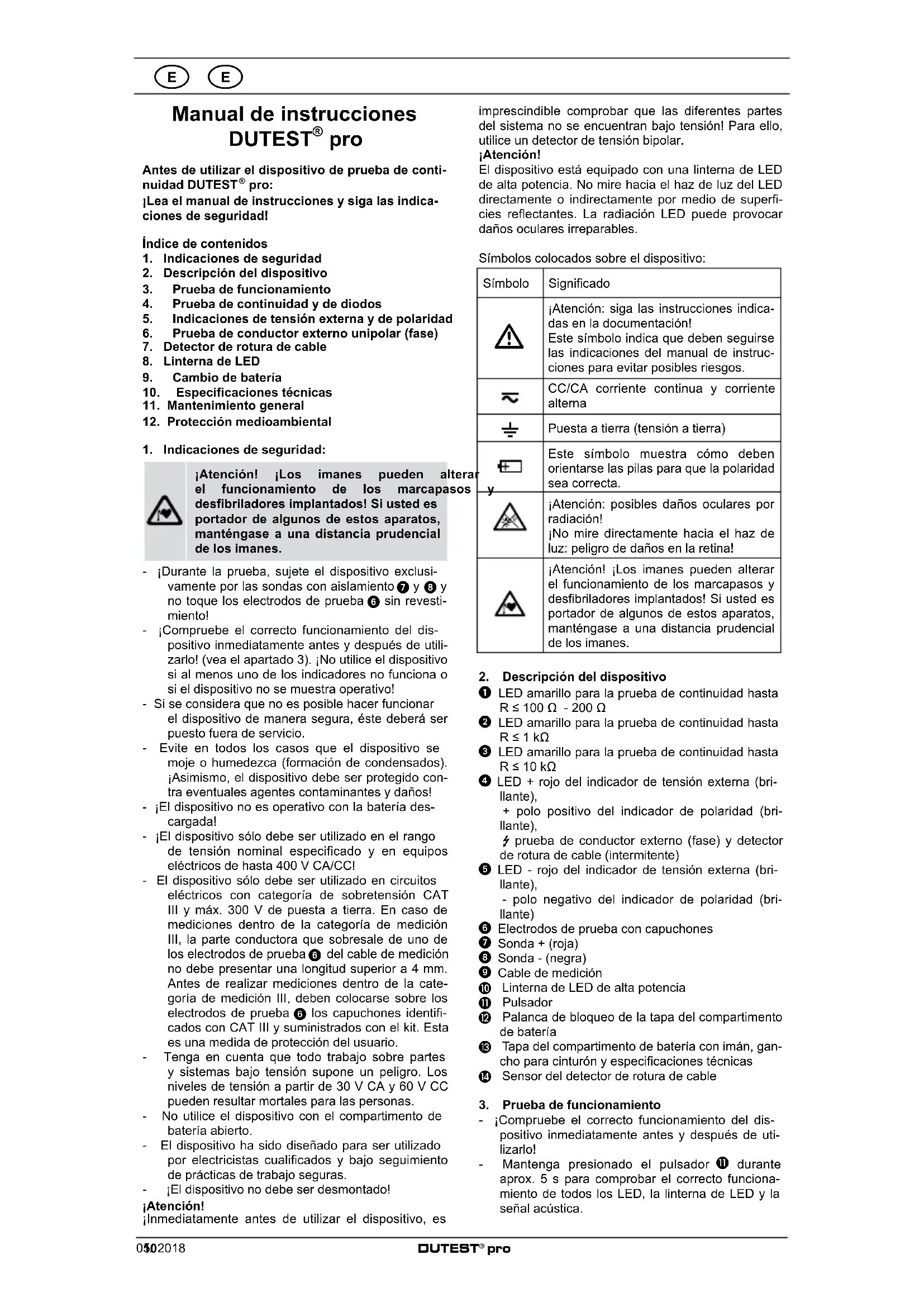 se apague. Indicador adicional para el detector de rotura de cable Si se ha activado un indicador adicional (tono inter- mitente o lámpara de LED parpadeante ) para la prueba unipolar de conductor externo (véase el capí- tulo 6), este indicador adicional se encontrará igual- mente activo para el detector de rotura de cable.05/ 2018 DUTEST