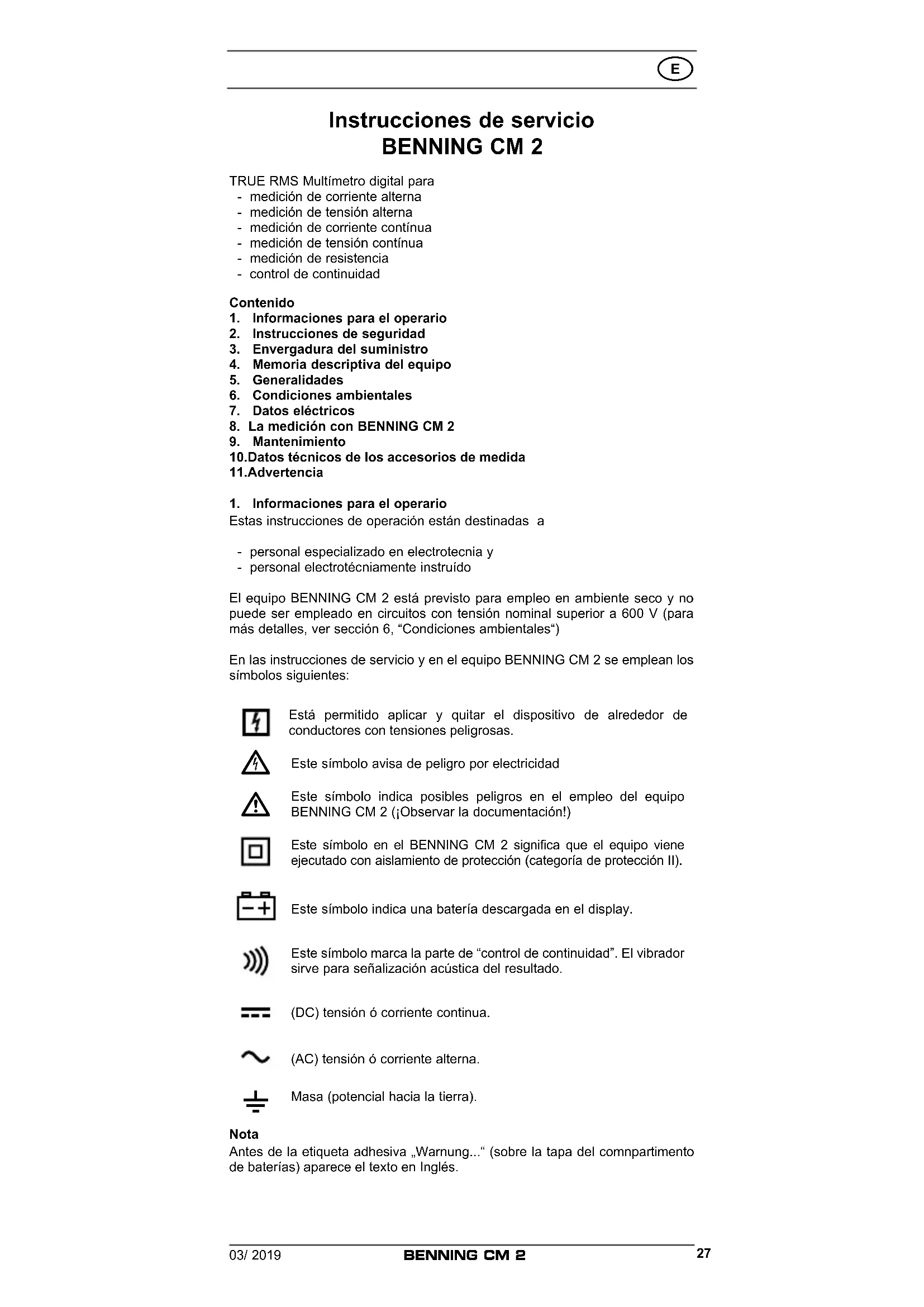 Masa (potencial hacia la tierra). Nota Antes de la etiqueta adhesiva „Warnung...“ (sobre la tapa del comnpartimento de baterías) aparece el texto en Inglés.03/ 2019 BENNING CM 2