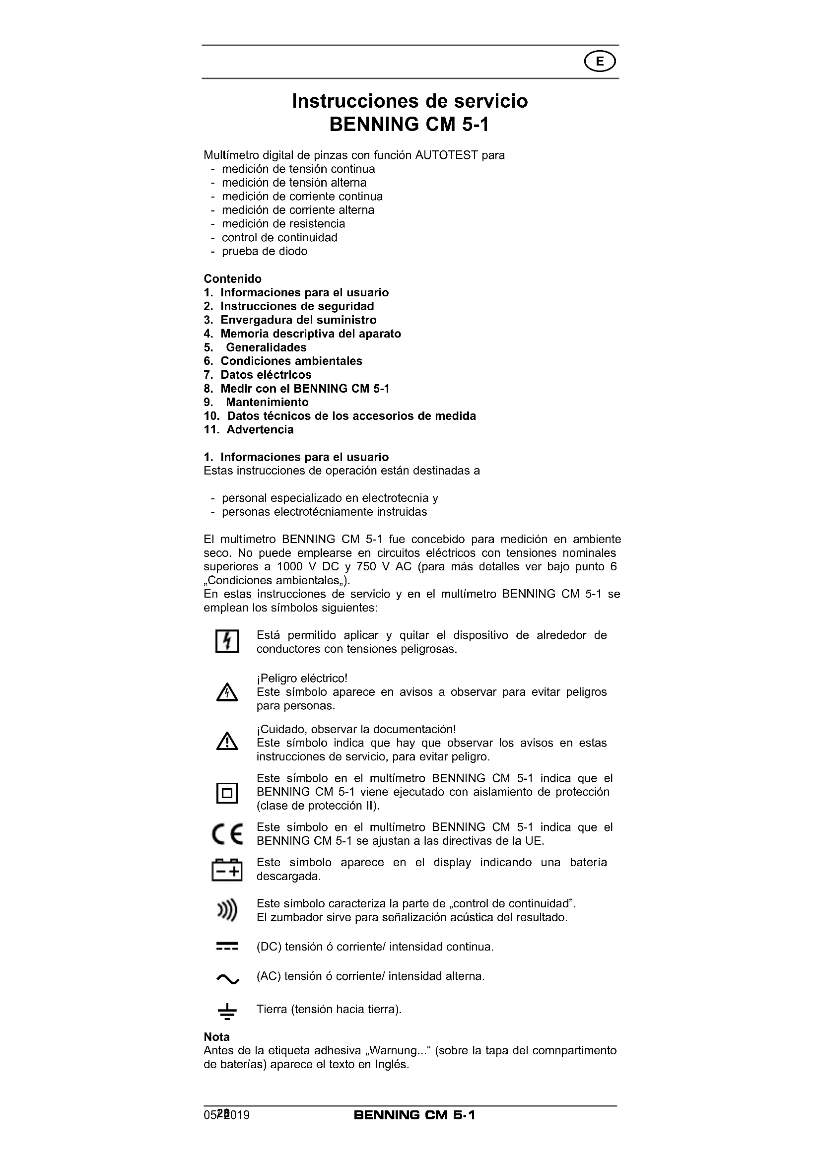 Tierra (tensión hacia tierra). Nota Antes de la etiqueta adhesiva „Warnung...“ (sobre la tapa del comnpartimento de baterías) aparece el texto en Inglés.BENNING CM 5-1 05/ 2019