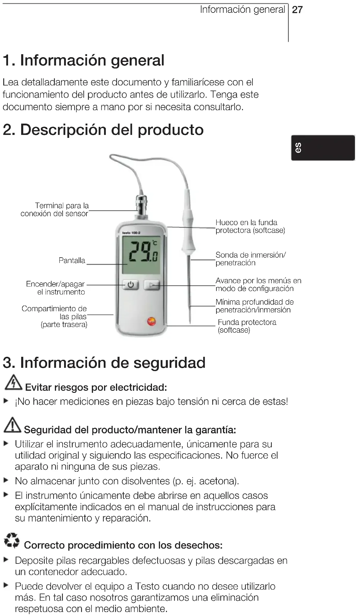 Evitar riesgos por electricidad: ¡No hacer mediciones en piezas bajo tensión ni cerca de estas! Seguridad del producto/mantener la garantía: Utilizar el instrumento adecuadamente, únicamente para su utilidad original y siguiendo las especificaciones. No fuerce el aparato ni ninguna de sus piezas. No almacenar junto con disolventes (p. ej. acetona). El instrumento únicamente debe abrirse en aquellos casos explícitamente indicados en el manual de instrucciones para su mantenimiento y reparación. Correcto procedimiento con los desechos: Deposite pilas recargables defectuosas y pilas descargadas en un contenedor adecuado. Puede devolver el equipo a Testo cuando no desee utilizarlo más. En tal caso nosotros garantizamos una eliminación respetuosa con el medio ambiente. deenfr esitptsvnl???? Información general Encender/apagar el instrumento Compartimiento de las pilas (parte trasera) Pantalla Terminal para la conexión del sensor Mínima profundidad de penetración/inmersión Funda protectora (softcase) Avance por los menús en modo de configuración Hueco en la funda protectora (softcase) Sonda de inmersión/ penetración28