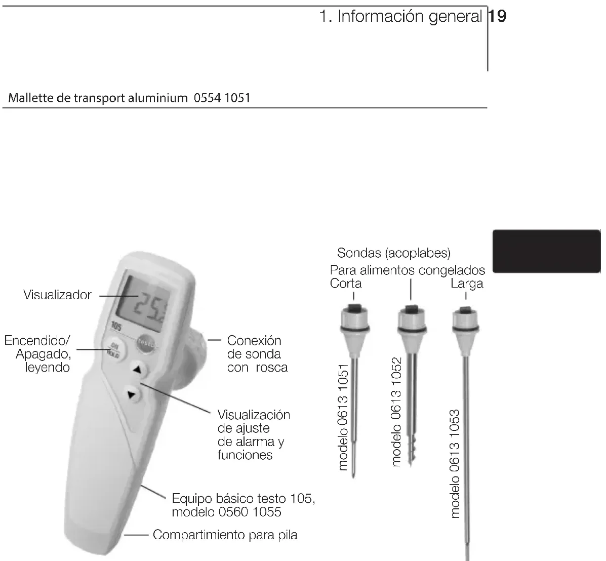 Visualización de ajuste de alarma y funciones Encendido/ Apagado, leyendo Compartimiento para pila Visualizador Conexión de sonda con rosca Sondas (acoplabes) Para alimentos congelados Corta Larga Equipo básico testo 105, modelo 0560 1055 modelo