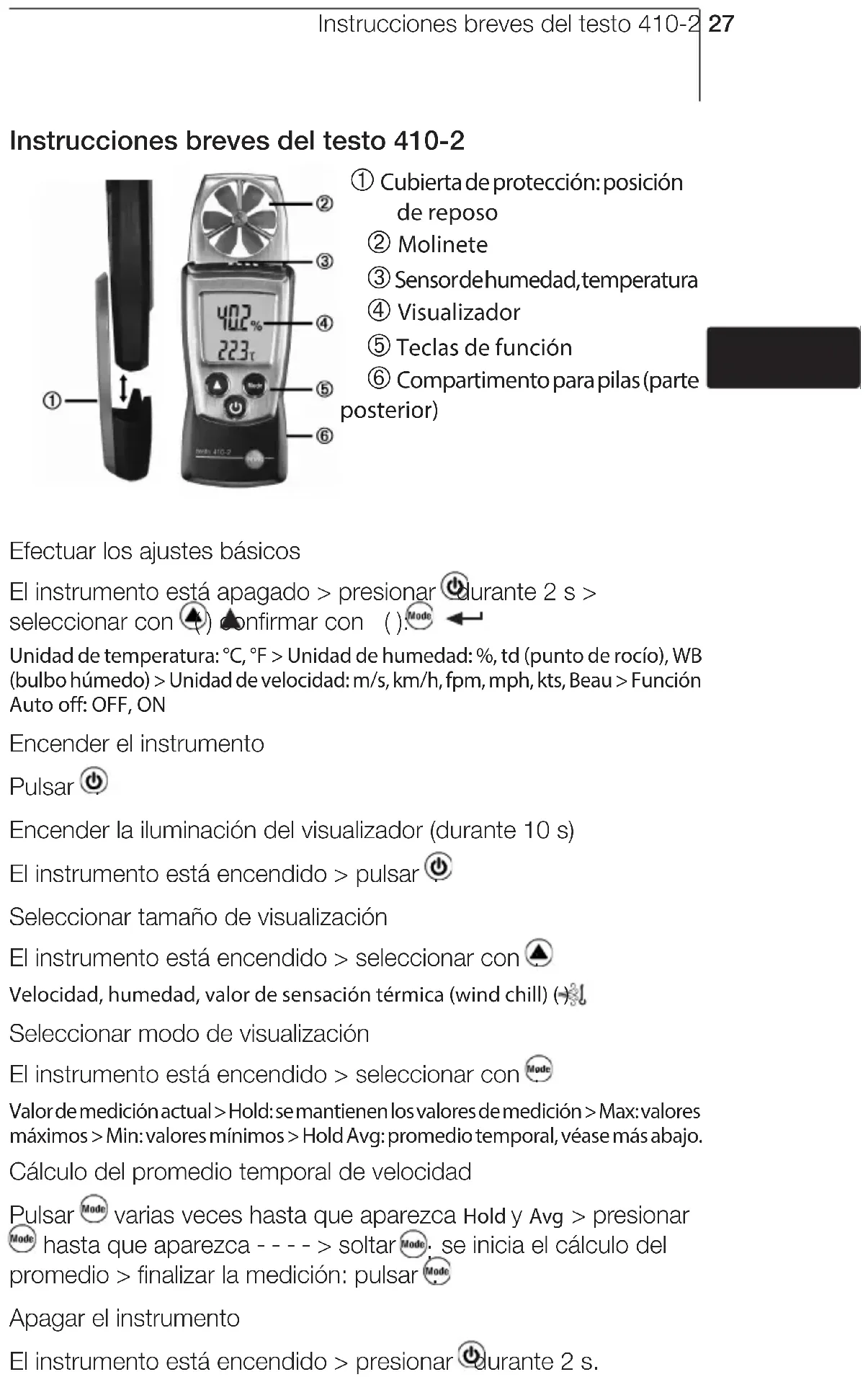 ??Notes26Instrucciones breves del testo 410-2 27 Instrucciones breves del testo 410-2 À Cubierta de protección: posición de reposo Á Molinete  Sensor de humedad, temperatura à Visualizador Ä Teclas de función Å Compartimento para pilas (parte posterior) Efectuar los ajustes básicos El instrumento está apagado > presionar durante 2 s > seleccionar con ( ) confirmar con ( ): Unidad de temperatura: °C, °F > Unidad de humedad: %, td (punto de rocío), WB (bulbo húmedo) > Unidad de velocidad: m/s, km/h, fpm, mph, kts, Beau > Función Auto off: OFF, ON Encender el instrumento Pulsar . Encender la iluminación del visualizador (durante 10 s) El instrumento está encendido > pulsar . Seleccionar tamaño de visualización El instrumento está encendido > seleccionar con : Velocidad, humedad, valor de sensación térmica (wind chill) ( ) Seleccionar modo de visualización El instrumento está encendido > seleccionar con : Valor de medición actual > Hold: se mantienen los valores de medición > Max: valores máximos > Min: valores mínimos > Hold Avg: promedio temporal, véase más abajo. Cálculo del promedio temporal de velocidad Pulsar varias veces hasta que aparezca Hold y Avg > presionar hasta que aparezca - - - - > soltar