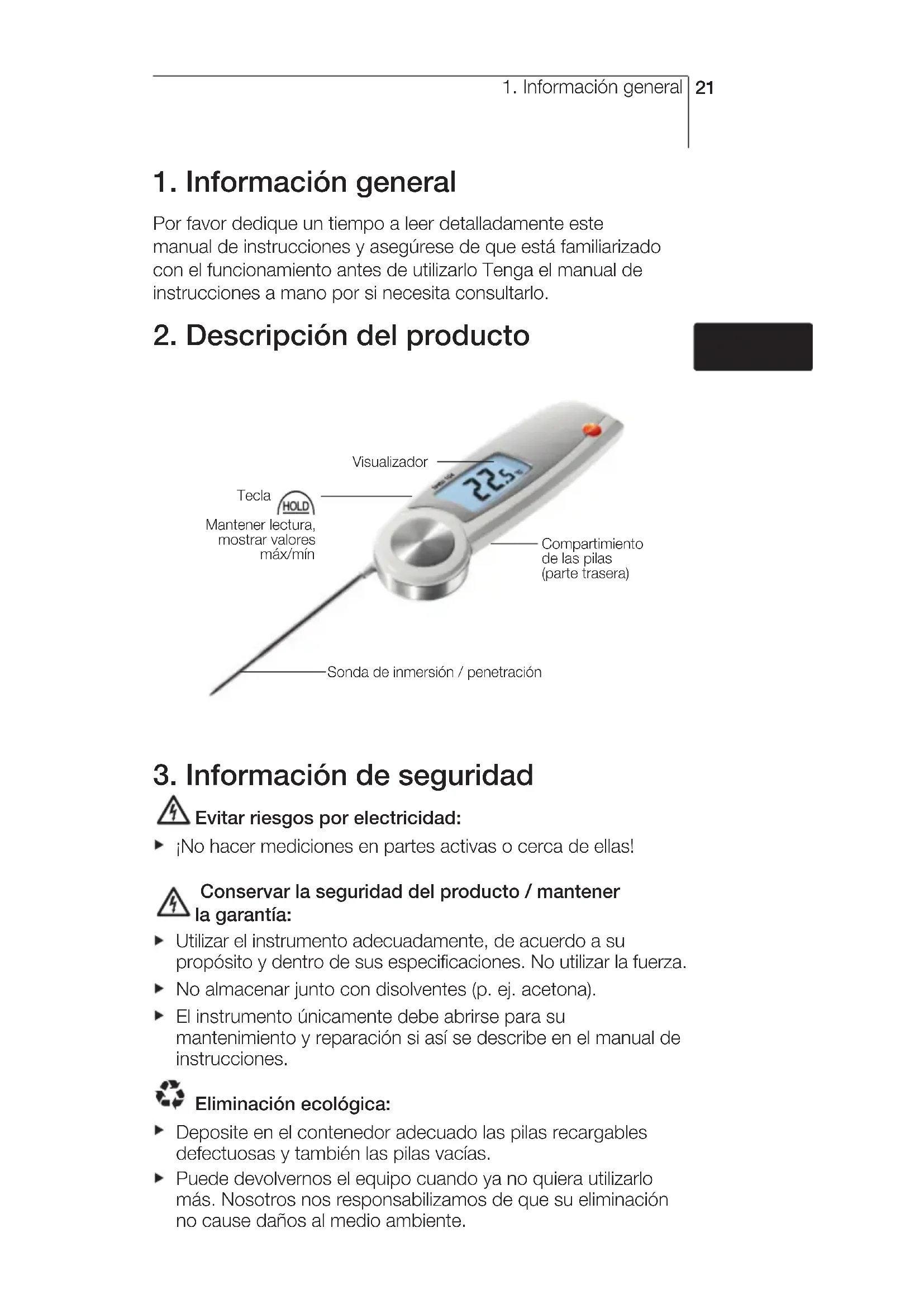 Evitar riesgos por electricidad: ¡No hacer mediciones en partes activas o cerca de ellas! Conservar la seguridad del producto / mantener la garantía: Utilizar el instrumento adecuadamente, de acuerdo a su propósito y dentro de sus especificaciones. No utilizar la fuerza. No almacenar junto con disolventes (p. ej. acetona). El instrumento únicamente debe abrirse para su mantenimiento y reparación si así se describe en el manual de instrucciones. Eliminación ecológica: Deposite en el contenedor adecuado las pilas recargables defectuosas y también las pilas vacías. Puede devolvernos el equipo cuando ya no quiera utilizarlo más. Nosotros nos responsabilizamos de que su eliminación no cause daños al medio ambiente. enfresitptsvnl???? Tecla Mantener lectura, mostrar valores máx/mín Compartimiento de las pilas (parte trasera) Visualizador Sonda de inmersión / penetración2222 4. Uso predefinido Atención: su producto está marcado con este símbolo. Significa que los productos eléctricos y electrónicos usados no deberían mezclarse con los residuos domésticos generales. Existe un sistema de recogida independiente para estos productos.