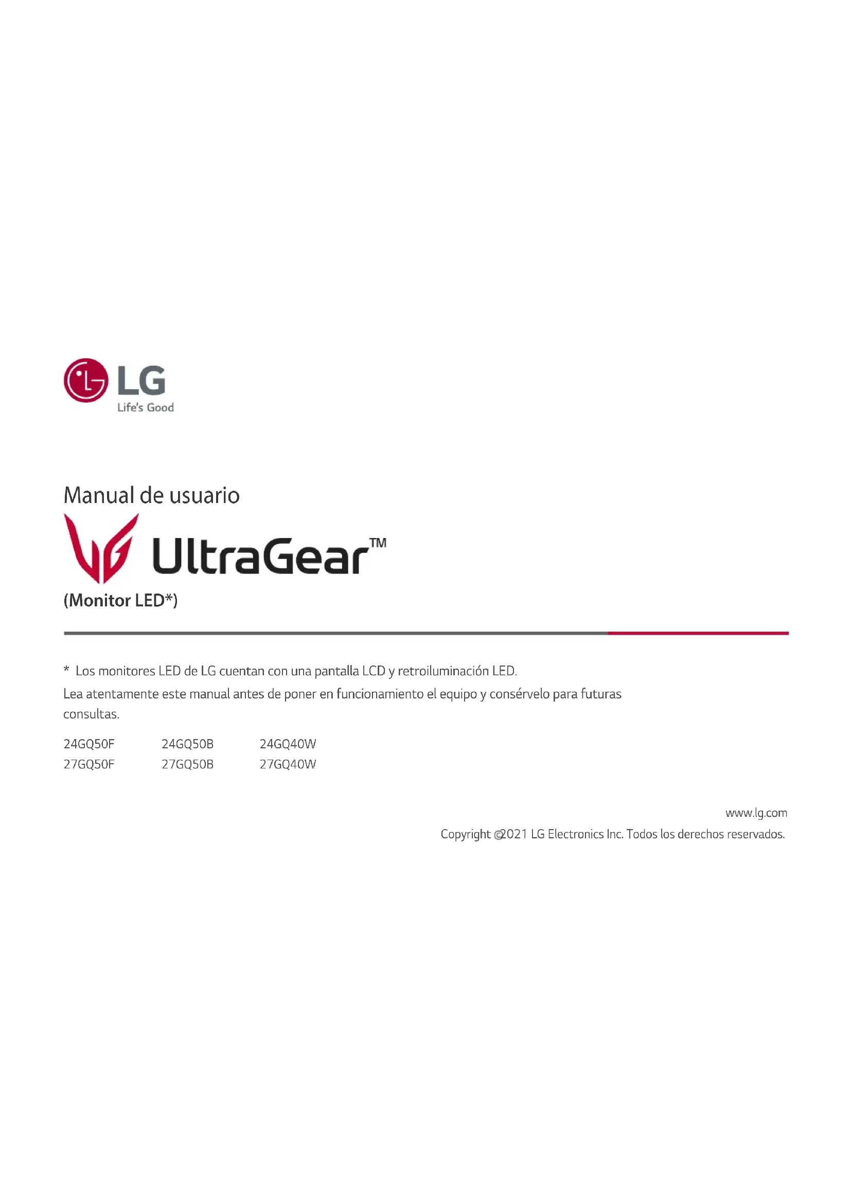 - Los monitores LED de LG cuentan con una pantalla LCD y retroiluminación LED. Lea atentamente este manual antes de poner en funcionamiento el equipo y consérvelo para futuras consultas. Manual de usuario 24GQ50F 27GQ50F 24GQ50B 27GQ50B 24GQ40W 27GQ40W2 ESPAÑOL