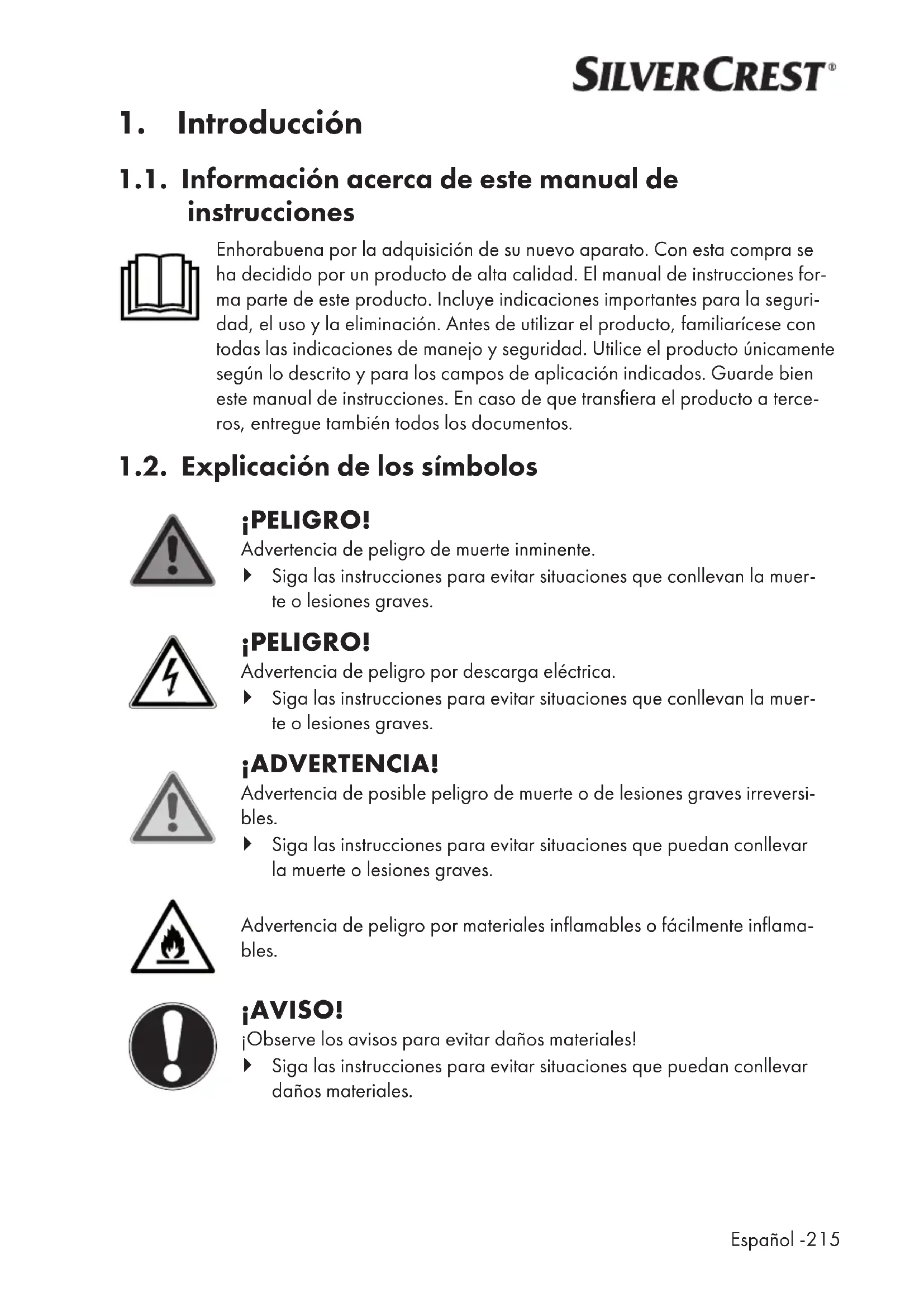 1.1. Información acerca de este manual de instrucciones Enhorabuena por la adquisición de su nuevo aparato. Con esta compra se ha decidido por un producto de alta calidad. El manual de instrucciones for- ma parte de este producto. Incluye indicaciones importantes para la seguri- dad, el uso y la eliminación. Antes de utilizar el producto, familiarícese con todas las indicaciones de manejo y seguridad. Utilice el producto únicamente según lo descrito y para los campos de aplicación indicados. Guarde bien este manual de instrucciones. En caso de que transfiera el producto a terce- ros, entregue también todos los documentos. 1.2. Explicación de los símbolos ¡PELIGRO! Advertencia de peligro de muerte inminente. Siga las instrucciones para evitar situaciones que conllevan la muer- te o lesiones graves. ¡PELIGRO! Advertencia de peligro por descarga eléctrica. Siga las instrucciones para evitar situaciones que conllevan la muer- te o lesiones graves. ¡ADVERTENCIA! Advertencia de posible peligro de muerte o de lesiones graves irreversi- bles. Siga las instrucciones para evitar situaciones que puedan conllevar la muerte o lesiones graves. Advertencia de peligro por materiales inflamables o fácilmente inflama- bles. ¡AVISO! ¡Observe los avisos para evitar daños materiales! Siga las instrucciones para evitar situaciones que puedan conllevar daños materiales.216 - Español Indicaciones sobre el ensamblaje o el funcionamiento. Respete las indicaciones del manual de instrucciones. Corriente alterna.
