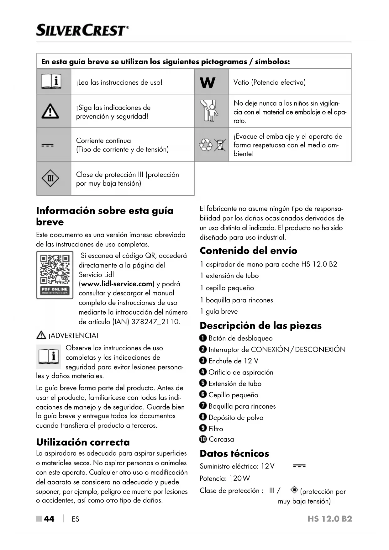 ES Información sobre esta guía breve Este documento es una versión impresa abreviada de las instrucciones de uso completas. Si escanea el código QR, accederá directamente a la página del Servicio Lidl (www.lidl-service.com) y podrá consultar y descargar el manual completo de instrucciones de uso mediante la introducción del número de artículo (IAN) 378247_2110. ¡ADVERTENCIA! Observe las instrucciones de uso completas y las indicaciones de seguridad para evitar lesiones persona- les y daños materiales. La guía breve forma parte del producto. Antes de usar el producto, familiarícese con todas las indi- caciones de manejo y de seguridad. Guarde bien la guía breve y entregue todos los documentos cuando transfiera el producto a terceros. Utilización correcta La aspiradora es adecuada para aspirar superficies o materiales secos. No aspirar personas o animales con este aparato. Cualquier otro uso o modificación del aparato se considera no adecuado y puede suponer, por ejemplo, peligro de muerte por lesiones o accidentes, así como otro tipo de daños. El fabricante no asume ningún tipo de responsa- bilidad por los daños ocasionados derivados de un uso distinto al indicado. El producto no ha sido diseñado para uso industrial. Contenido del envío 1 aspirador de mano para coche HS 12.0 B2 1 extensión de tubo 1 cepillo pequeño 1 boquilla para rincones 1 guía breve Descripción de las piezas Botón de desbloqueo Interruptor de CONEXIÓN / DESCONEXIÓN Enchufe de 12 V Orificio de aspiración Extensión de tubo Cepillo pequeño Boquilla para rincones Depósito de polvo Filtro Carcasa Datos técnicos Suministro eléctrico: 12 V Potencia: 120 W Clase de protección : III / (protección por muy baja tensión) En esta guía breve se utilizan los siguientes pictogramas / símbolos: ¡Lea las instrucciones de uso!