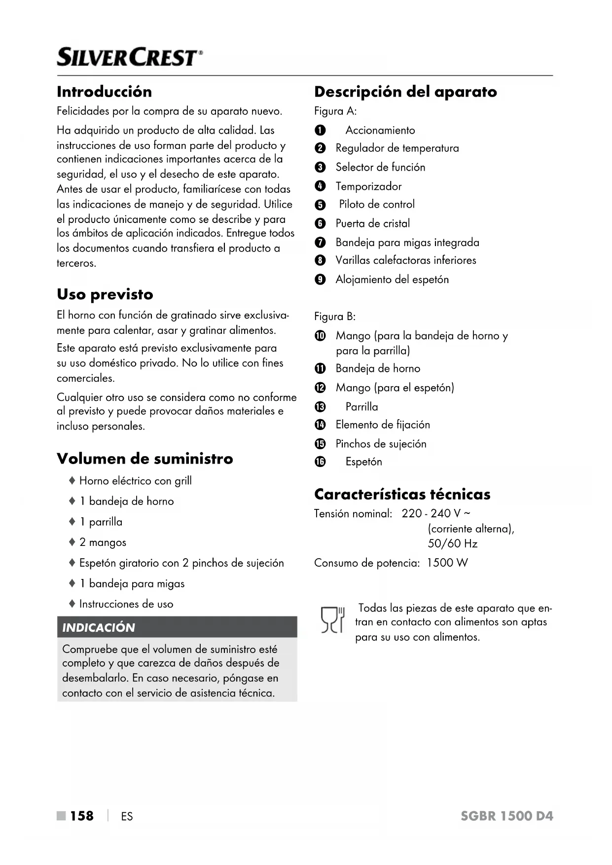 Piloto de control 6 Puerta de cristal 7 Bandeja para migas integrada 8 Varillas calefactoras inferiores 9 Alojamiento del espetón Figura B: 0 Mango (para la bandeja de horno y para la parrilla) q Bandeja de horno w Mango (para el espetón) e Parrilla r Elemento de fijación t Pinchos de sujeción z Espetón Características técnicas Tensión nominal: 220 - 240 V ∼ (corriente alterna), 50/60 Hz Consumo de potencia: 1500 W Todas las piezas de este aparato que en- tran en contacto con alimentos son aptas para su uso con alimentos.SGBR 1500 D4 ES