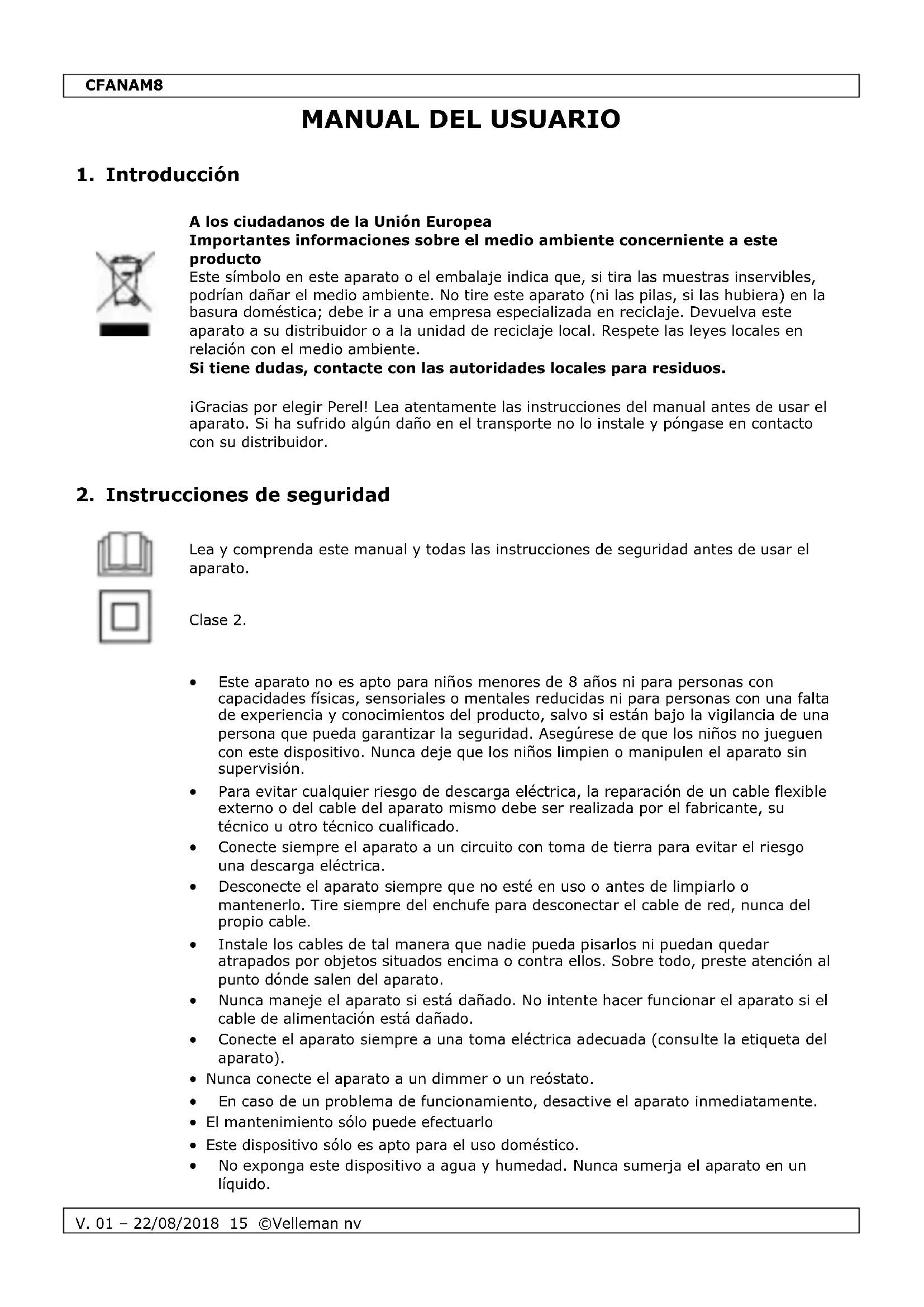 Utilice este aparato sólo con los accesorios originales. Velleman NV no será responsable de daños ni lesiones causados por un uso (indebido) de este aparato. Para más información sobre este producto y la versión más reciente de este manual del usuario, visite nuestra página www.perel.eu. Se pueden modificar las especificaciones y el contenido de este manual sin previo aviso.