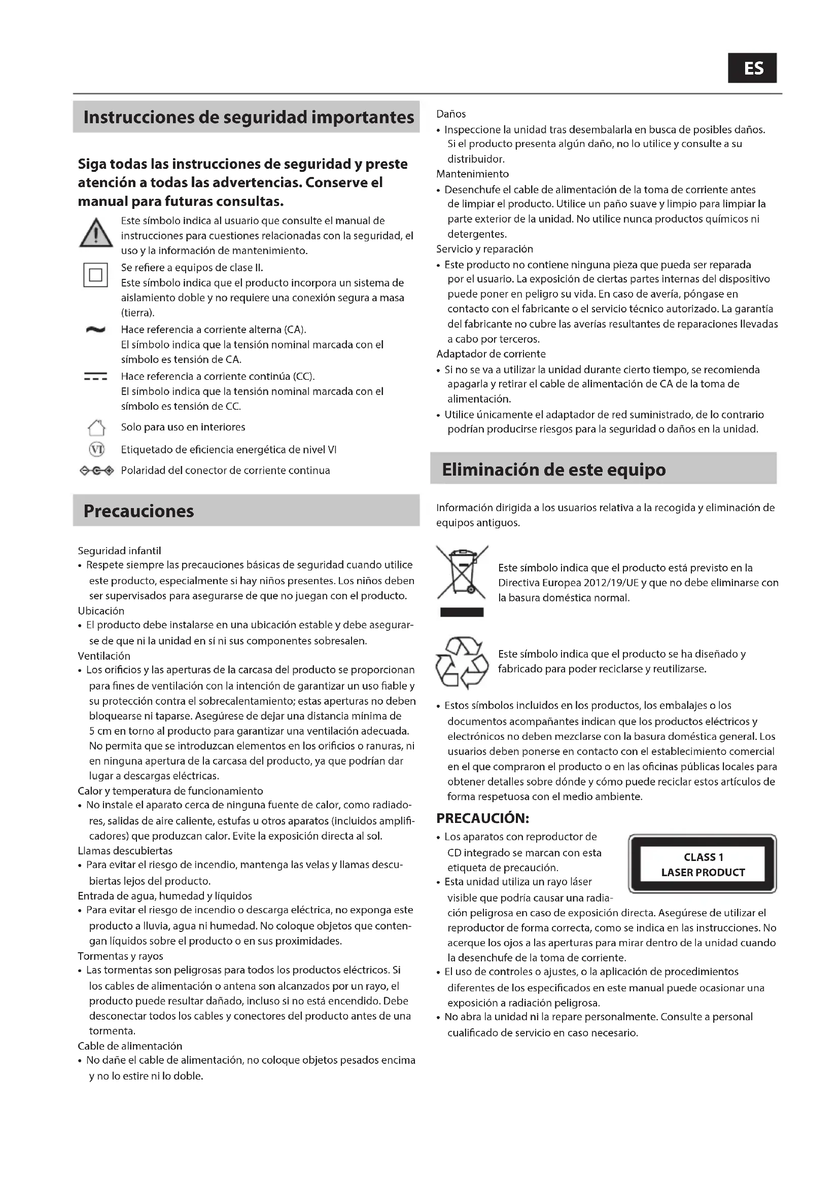 - Utilice únicamente el adaptador de red suministrado, de lo contrario podrían producirse riesgos para la seguridad o daños en la unidad. Eliminación de este equipo Información dirigida a los usuarios relativa a la recogida y eliminación de equipos antiguos. Este símbolo indica que el producto está previsto en la Directiva Europea 2012/19/UE y que no debe eliminarse con la basura doméstica normal. Este símbolo indica que el producto se ha diseñado y fabricado para poder reciclarse y reutilizarse.