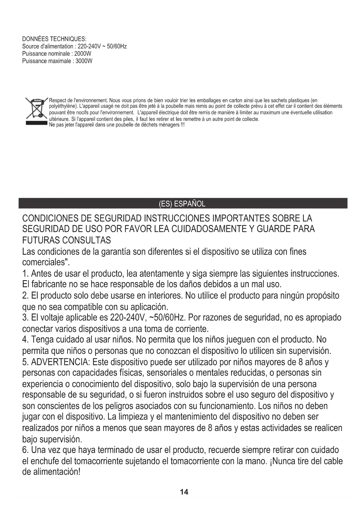 Fuente de alimentación: 220-240V ~ 50/60Hz Potencia nominal: 2000W Potencia máxima: 3000W Después de la limpieza, seque las placas limpias y vuelva a instalarlas en el dispositivo. Preocupación por el medio ambiente. Por favor, lleva las cajas de cartón a un sitio de reciclaje. Las bolsas de polietileno se deben tirar al cubo de la basura amarillo (para envases). El equipo gastado debe ser entregado en el punto de almacenamiento adecuado, porque las piezas que constituyen el equipo pueden suponer un peligro para el medio ambiente. Debes entregar el equipo Hay que devolver el equipo eléctrico con el fin de evitar su reutilización. Si en el equipo se encuentran pilas, hay que sacarlas y entregar por separado, en un punto de almacenamiento adecuado. No tires el equipo al contenedor para residuos urbanos!!18 As condições de garantia são diferentes se o dispositivo for usado para fins comerciais." CONDIÇÕES DE SEGURANÇA INSTRUÇÕES IMPORTANTES SOBRE SEGURANÇA DE USO POR FAVOR, LEIA ATENTAMENTE E GUARDE PARA REFERÊNCIA FUTURA