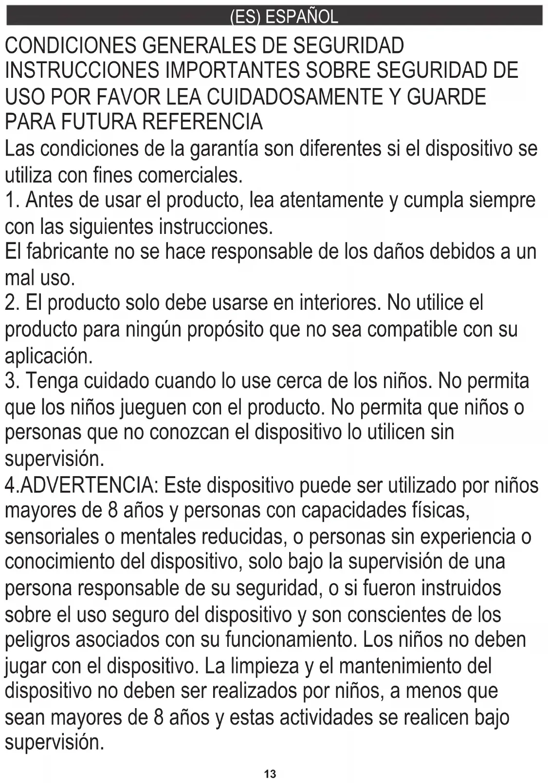que los niños jueguen con el producto. No permita que niños o personas que no conozcan el dispositivo lo utilicen sin supervisión. 4.ADVERTENCIA: Este dispositivo puede ser utilizado por niños mayores de 8 años y personas con capacidades físicas, sensoriales o mentales reducidas, o personas sin experiencia o conocimiento del dispositivo, solo bajo la supervisión de una persona responsable de su seguridad, o si fueron instruidos sobre el uso seguro del dispositivo y son conscientes de los peligros asociados con su funcionamiento. Los niños no deben jugar con el dispositivo. La limpieza y el mantenimiento del dispositivo no deben ser realizados por niños, a menos que sean mayores de 8 años y estas actividades se realicen bajo supervisión.14