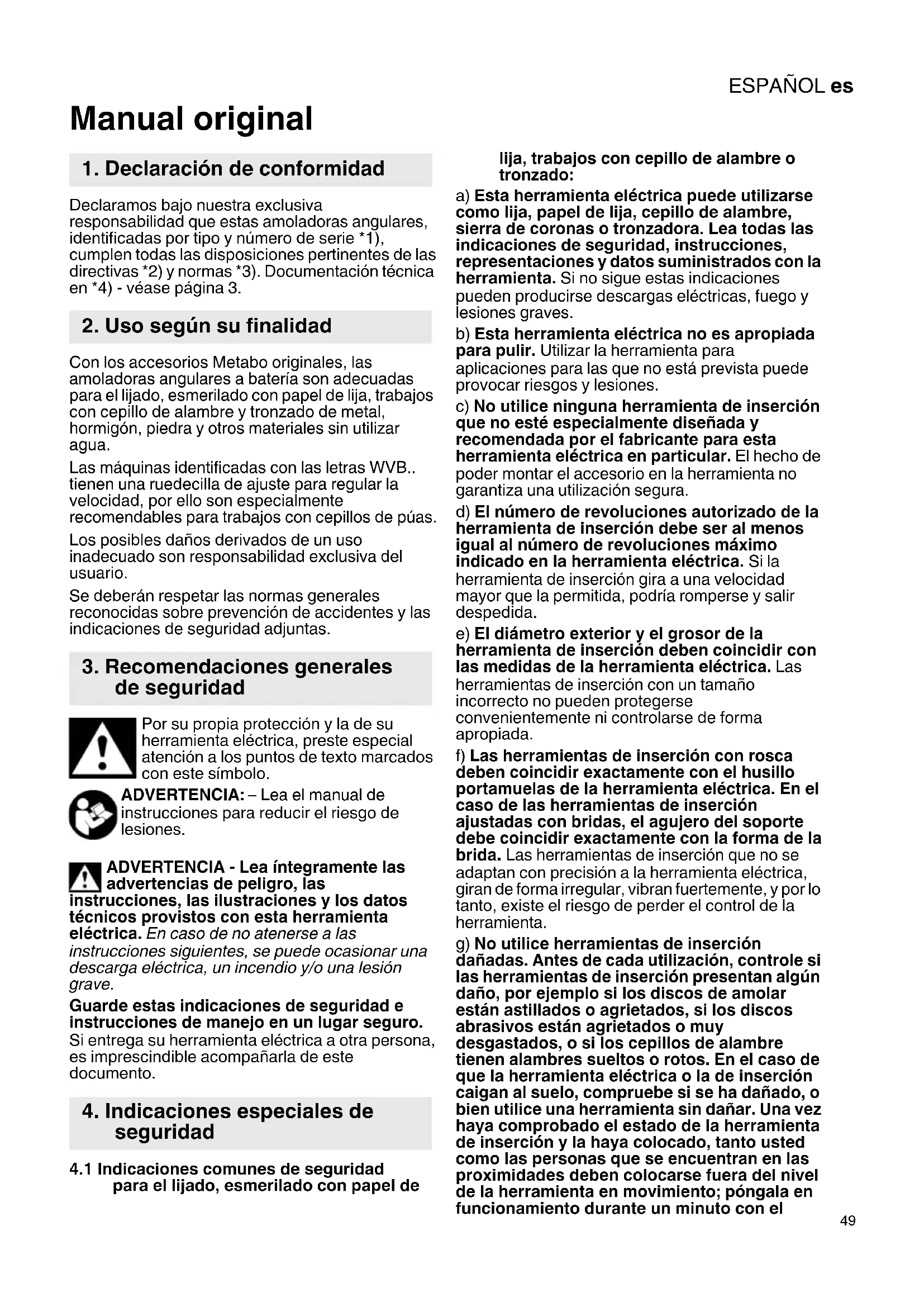 Manual original Declaramos bajo nuestra exclusiva responsabilidad que estas amoladoras angulares, identificadas por tipo y número de serie *1), cumplen todas las disposiciones pertinentes de las directivas *2) y normas *3). Documentación técnica en *4) - véase página 3. Con los accesorios Metabo originales, las amoladoras angulares a batería son adecuadas para el lijado, esmerilado con papel de lija, trabajos con cepillo de alambre y tronzado de metal, hormigón, piedra y otros materiales sin utilizar agua. Las máquinas identificadas con las letras WVB.. tienen una ruedecilla de ajuste para regular la velocidad, por ello son especialmente recomendables para trabajos con cepillos de púas. Los posibles daños derivados de un uso inadecuado son responsabilidad exclusiva del usuario. Se deberán respetar las normas generales reconocidas sobre prevención de accidentes y las indicaciones de seguridad adjuntas. Por su propia protección y la de su herramienta eléctrica, preste especial atención a los puntos de texto marcados con este símbolo. ADVERTENCIA: – Lea el manual de instrucciones para reducir el riesgo de lesiones. ADVERTENCIA - Lea íntegramente las advertencias de peligro, las instrucciones, las ilustraciones y los datos técnicos provistos con esta herramienta eléctrica. En caso de no atenerse a las instrucciones siguientes, se puede ocasionar una descarga eléctrica, un incendio y/o una lesión grave. Guarde estas indicaciones de seguridad e instrucciones de manejo en un lugar seguro. Si entrega su herramienta eléctrica a otra persona, es imprescindible acompañarla de este documento.