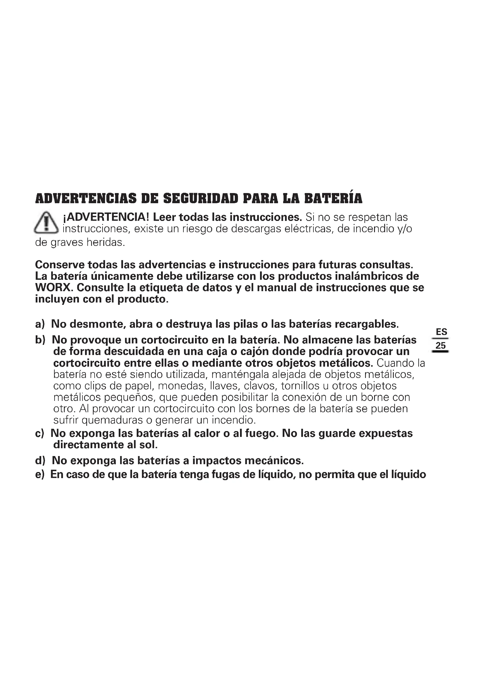 ADVERTENCIAS DE SEGURIDAD PARA LA BATERÍA ¡ADVERTENCIA! Leer todas las instrucciones. Si no se respetan las instrucciones, existe un riesgo de descargas eléctricas, de incendio y/o de graves heridas. Conserve todas las advertencias e instrucciones para futuras consultas. La batería únicamente debe utilizarse con los productos inalámbricos de WORX. Consulte la etiqueta de datos y el manual de instrucciones que se incluyen con el producto. a) No desmonte, abra o destruya las pilas o las baterías recargables. b) No provoque un cortocircuito en la batería. No almacene las baterías de forma descuidada en una caja o cajón donde podría provocar un cortocircuito entre ellas o mediante otros objetos metálicos. Cuando la batería no esté siendo utilizada, manténgala alejada de objetos metálicos, como clips de papel, monedas, llaves, clavos, tornillos u otros objetos metálicos pequeños, que pueden posibilitar la conexión de un borne con otro. Al provocar un cortocircuito con los bornes de la batería se pueden sufrir quemaduras o generar un incendio. c) No exponga las baterías al calor o al fuego. No las guarde expuestas directamente al sol. d) No exponga las baterías a impactos mecánicos. e) En caso de que la batería tenga fugas de líquido, no permita que el líquido26