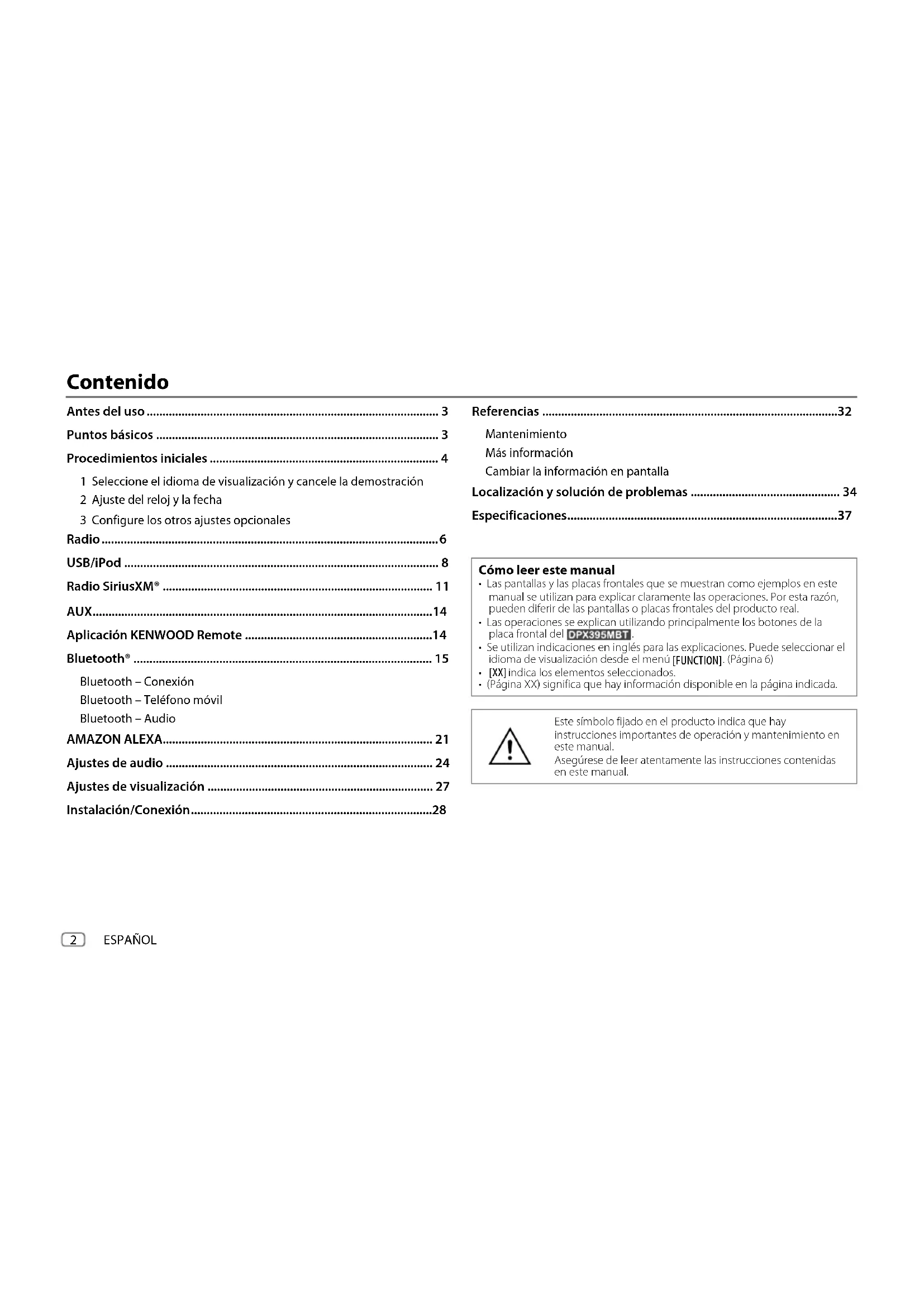 - (Página XX) significa que hay información disponible en la página indicada. Este símbolo fijado en el producto indica que hay instrucciones importantes de operación y mantenimiento en este manual. Asegúrese de leer atentamente las instrucciones contenidas en este manual. DPX395MBT_K_SP.indd 2DPX395MBT_K_SP.indd 2 20/4/2022 5:16:20 PM20/4/2022 5:16:20 PMESPAÑOL