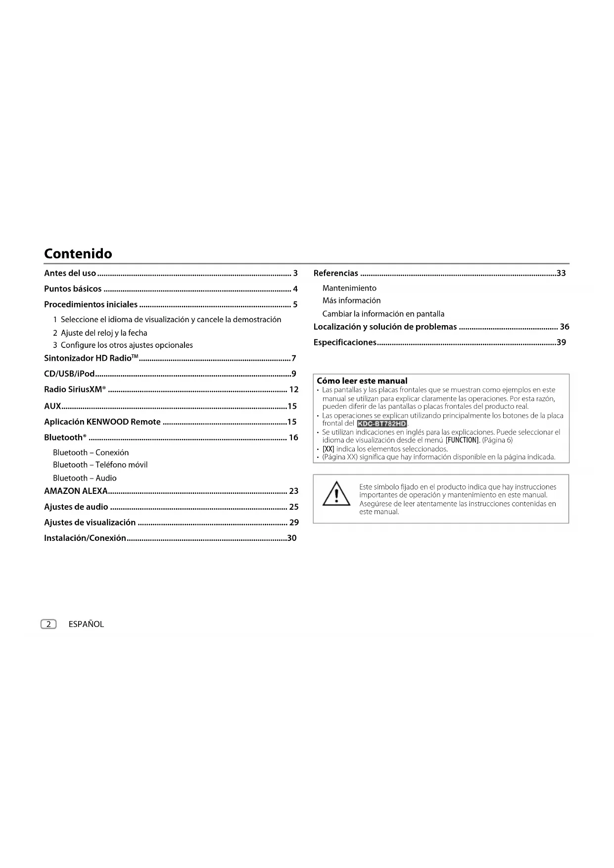- (PáginaXX) significa que hay información disponible en la página indicada. KDC-BT782HD_K_SP.indd 2KDC-BT782HD_K_SP.indd 2 10/3/2022 2:17:38 PM10/3/2022 2:17:38 PMESPAÑOL