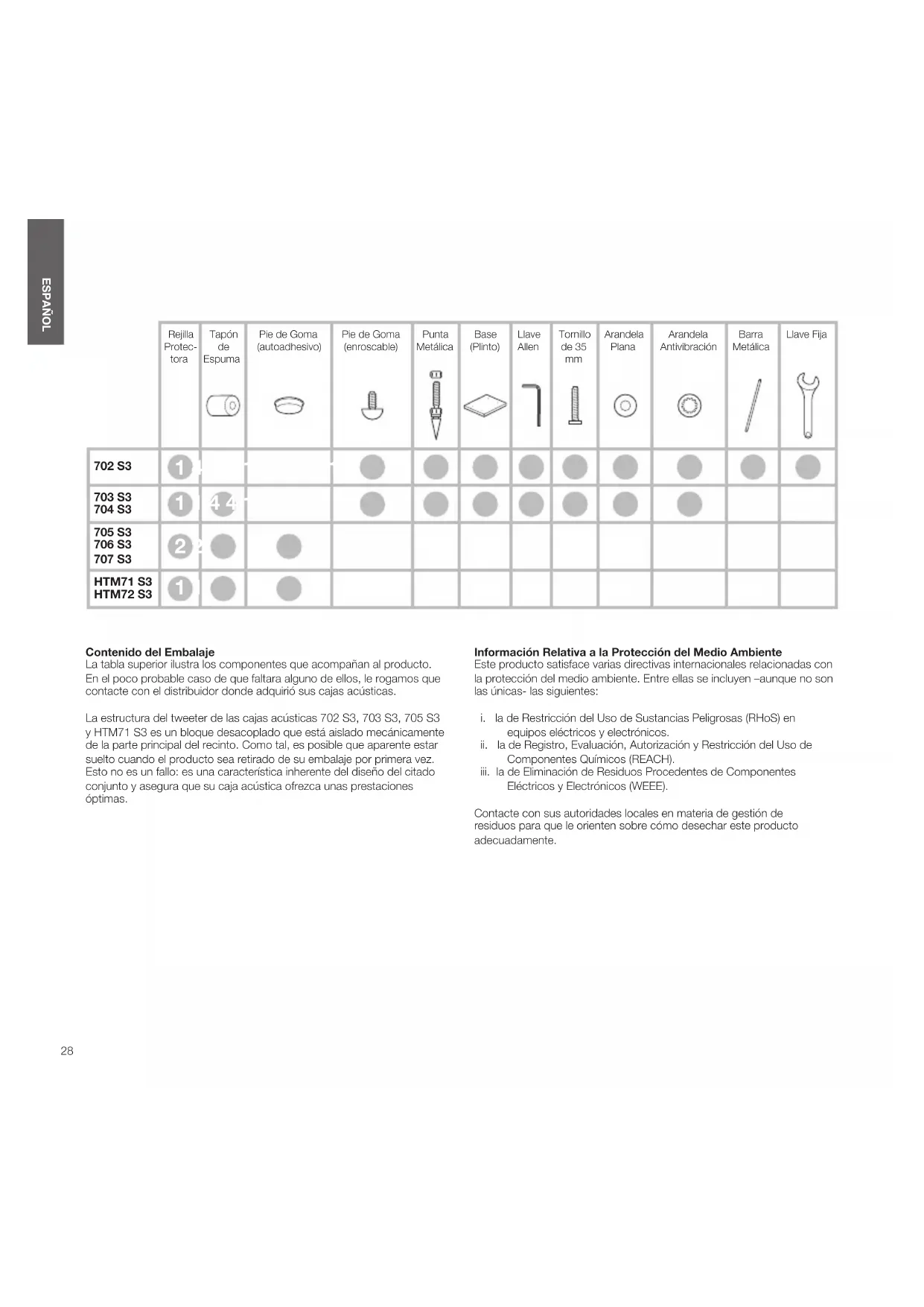 ESPAÑOL Contenido del Embalaje La tabla superior ilustra los componentes que acompañan al producto. En el poco probable caso de que faltara alguno de ellos, le rogamos que contacte con el distribuidor donde adquirió sus cajas acústicas. La estructura del tweeter de las cajas acústicas 702 S3, 703 S3, 705 S3 y HTM71 S3 es un bloque desacoplado que está aislado mecánicamente de la parte principal del recinto. Como tal, es posible que aparente estar suelto cuando el producto sea retirado de su embalaje por primera vez. Esto no es un fallo: es una característica inherente del diseño del citado conjunto y asegura que su caja acústica ofrezca unas prestaciones óptimas. Información Relativa a la Protección del Medio Ambiente Este producto satisface varias directivas internacionales relacionadas con la protección del medio ambiente. Entre ellas se incluyen –aunque no son las únicas- las siguientes: