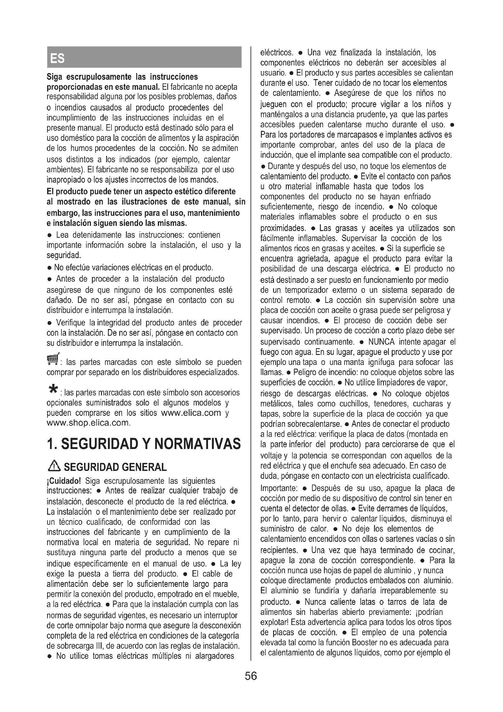 Als de storing na het uitvoeren van deze controles nog steeds aanwezig is, neem dan contact op met de dichtstbij- zijnde Servicedienst. 55ES Siga escrupulosamente las instrucciones proporcionadas en este manual. El fabricante no acepta responsabilidad alguna por los posibles problemas, daños o incendios causados al producto procedentes del incumplimiento de las instrucciones incluidas en el presente manual. El producto está destinado sólo para el uso doméstico para la cocción de alimentos y la aspiración de los humos procedentes de la cocción. No se admiten usos distintos a los indicados (por ejemplo, calentar ambientes). El fabricante no se responsabiliza por el uso inapropiado o los ajustes incorrectos de los mandos. El producto puede tener un aspecto estético diferente al mostrado en las ilustraciones de este manual, sin embargo, las instrucciones para el uso, mantenimiento e instalación siguen siendo las mismas. ● Lea detenidamente las instrucciones: contienen importante información sobre la instalación, el uso y la seguridad. ● No efectúe variaciones eléctricas en el producto. ● Antes de proceder a la instalación del producto asegúrese de que ninguno de los componentes esté dañado. De no ser así, póngase en contacto con su distribuidor e interrumpa la instalación. ● Verifique la integridad del producto antes de proceder con la instalación. De no ser así, póngase en contacto con su distribuidor e interrumpa la instalación. : las partes marcadas con este símbolo se pueden comprar por separado en los distribuidores especializados. : las partes marcadas con este símbolo son accesorios opcionales suministrados solo el algunos modelos y pueden comprarse en los sitios www.elica.com y www.shop.elica.com.