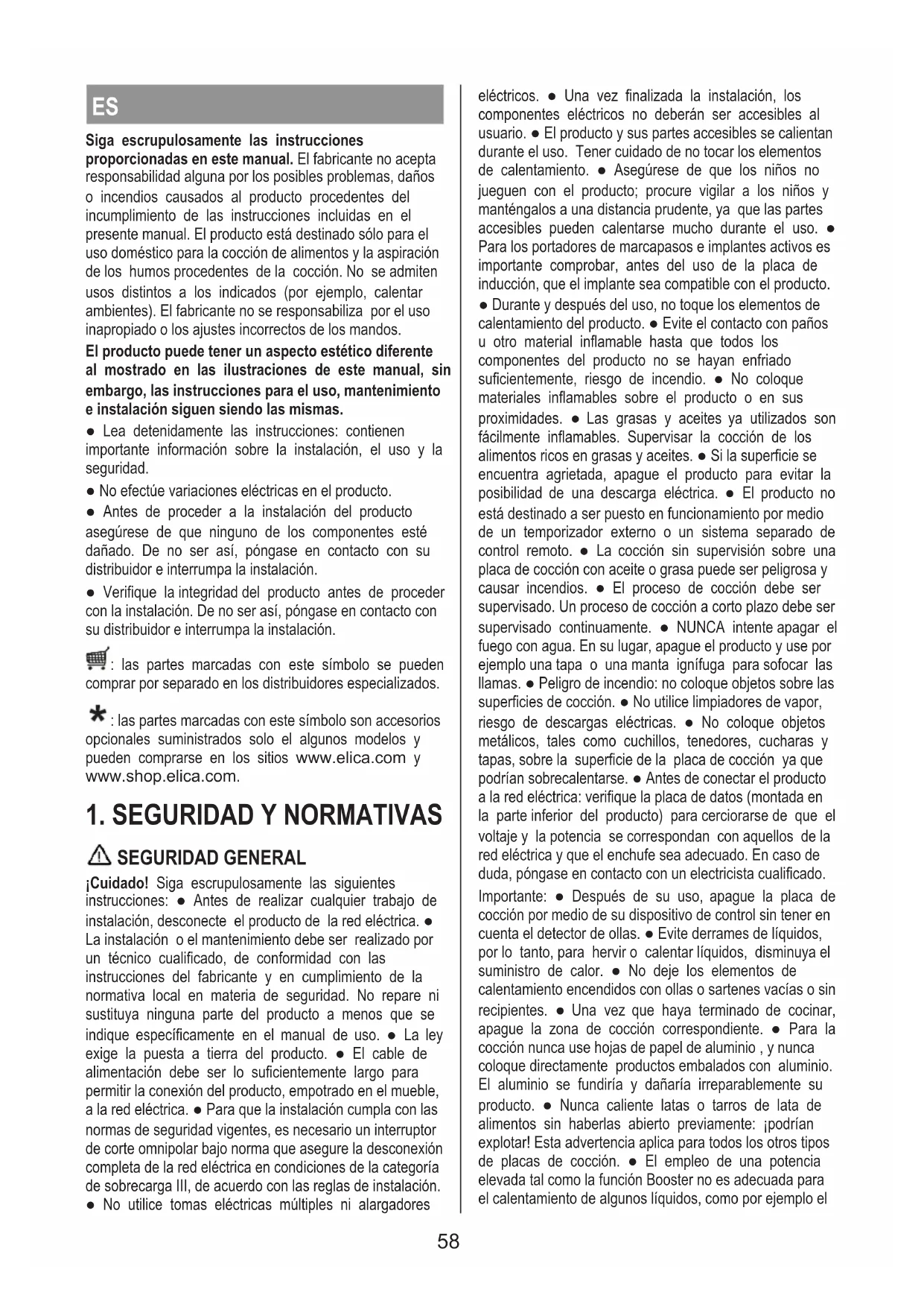 Als de storing na het uitvoeren van deze controles nog steeds aanwezig is, neem dan contact op met de dichtstbij- zijnde Servicedienst. 57ES Siga escrupulosamente las instrucciones proporcionadas en este manual. El fabricante no acepta responsabilidad alguna por los posibles problemas, daños o incendios causados al producto procedentes del incumplimiento de las instrucciones incluidas en el presente manual. El producto está destinado sólo para el uso doméstico para la cocción de alimentos y la aspiración de los humos procedentes de la cocción. No se admiten usos distintos a los indicados (por ejemplo, calentar ambientes). El fabricante no se responsabiliza por el uso inapropiado o los ajustes incorrectos de los mandos. El producto puede tener un aspecto estético diferente al mostrado en las ilustraciones de este manual, sin embargo, las instrucciones para el uso, mantenimiento e instalación siguen siendo las mismas. ● Lea detenidamente las instrucciones: contienen importante información sobre la instalación, el uso y la seguridad. ● No efectúe variaciones eléctricas en el producto. ● Antes de proceder a la instalación del producto asegúrese de que ninguno de los componentes esté dañado. De no ser así, póngase en contacto con su distribuidor e interrumpa la instalación. ● Verifique la integridad del producto antes de proceder con la instalación. De no ser así, póngase en contacto con su distribuidor e interrumpa la instalación. : las partes marcadas con este símbolo se pueden comprar por separado en los distribuidores especializados. : las partes marcadas con este símbolo son accesorios opcionales suministrados solo el algunos modelos y pueden comprarse en los sitios www.elica.com y www.shop.elica.com.