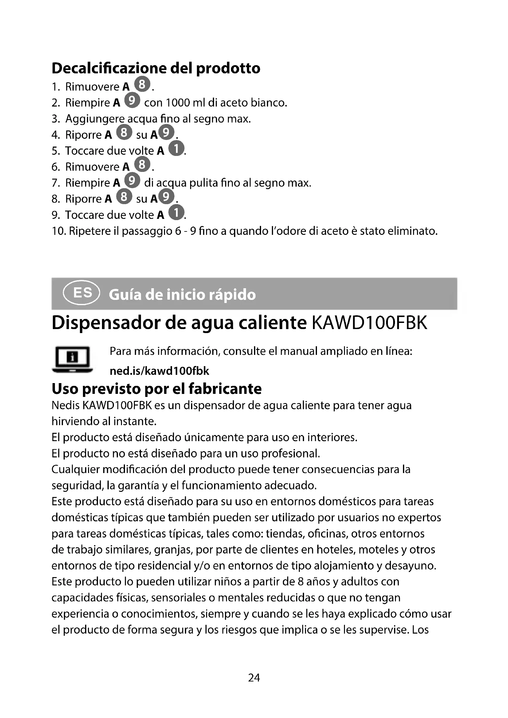 Guía de inicio rápido Dispensador de agua caliente KAWD100FBK Para más información, consulte el manual ampliado en línea: ned.is/kawd100fbk Uso previsto por el fabricante Nedis KAWD100FBK es un dispensador de agua caliente para tener agua hirviendo al instante. El producto está diseñado únicamente para uso en interiores. El producto no está diseñado para un uso profesional. Cualquier modicación del producto puede tener consecuencias para la seguridad, la garantía y el funcionamiento adecuado. Este producto está diseñado para su uso en entornos domésticos para tareas domésticas típicas que también pueden ser utilizado por usuarios no expertos para tareas domésticas típicas, tales como: tiendas, ocinas, otros entornos de trabajo similares, granjas, por parte de clientes en hoteles, moteles y otros entornos de tipo residencial y/o en entornos de tipo alojamiento y desayuno. Este producto lo pueden utilizar niños a partir de 8 años y adultos con capacidades físicas, sensoriales o mentales reducidas o que no tengan experiencia o conocimientos, siempre y cuando se les haya explicado cómo usar el producto de forma segura y los riesgos que implica o se les supervise. Los KAWD100FBK_MAN_COMP_0520_print_(20161 1422)_v00.01.indd 24KAWD100FBK_MAN_COMP_0520_print_(20161 1422)_v00.01.indd 24 18-05-2020 09:0818-05-2020 09:0825 niños no deben jugar con el producto. Los niños no deben realizar las tareas de limpieza ni mantenimiento sin supervisión. Especicaciones Producto Dispensador de agua caliente Número de artículo KAWD100FBK Dimensiones (la x an x al) 240 x 140 x 300 mm Peso 1595 g Suministro eléctrico 220 - 240 VAC / 50/60 Hz Consumo de energía 2200 - 2600 W Alimentación en modo de espera 0,5 W Cantidad de agua 0,5 - 2,5 L Partes principales (imagen A)