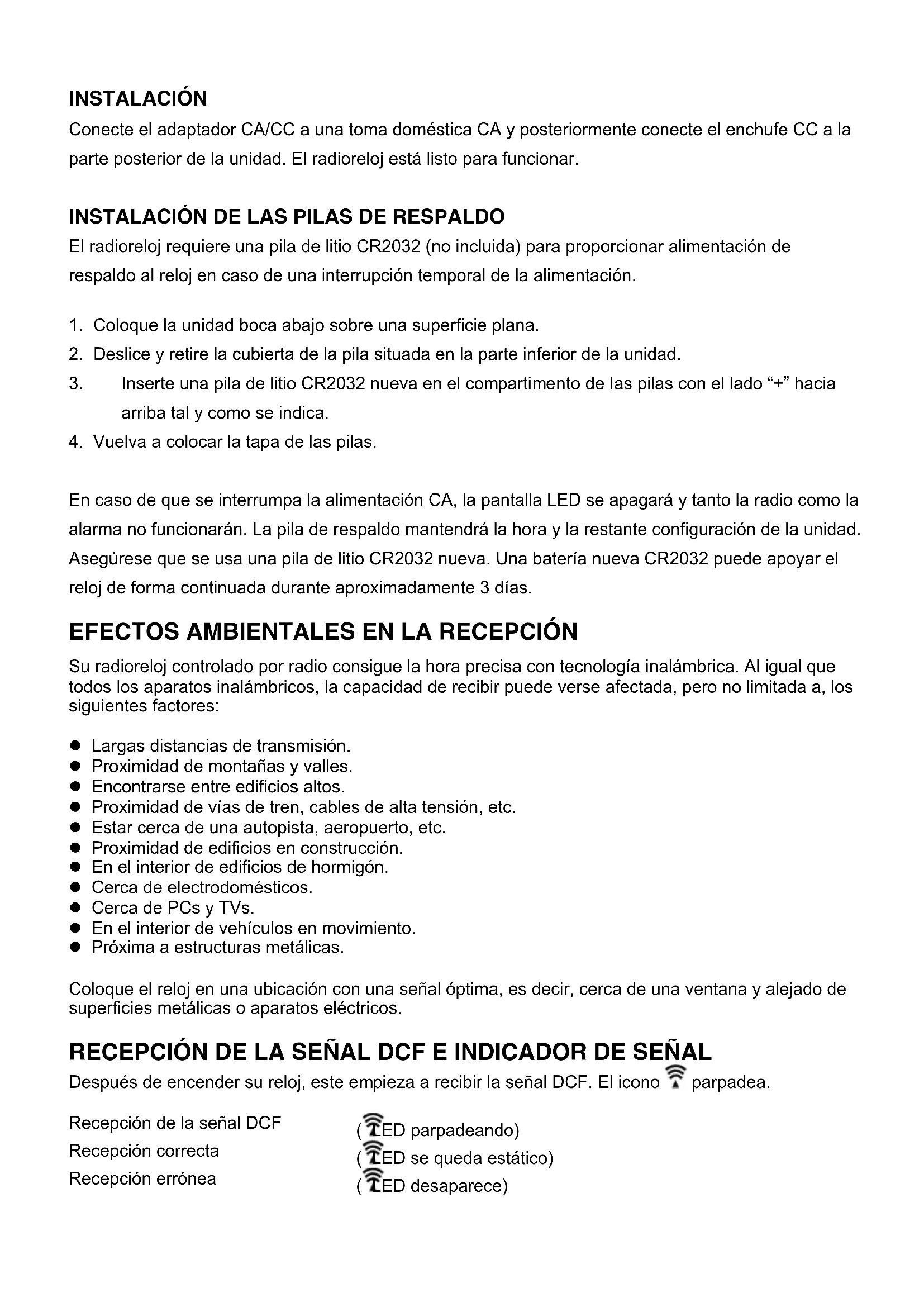 Su radioreloj controlado por radio consigue la hora precisa con tecnología inalámbrica. Al igual que todos los aparatos inalámbricos, la capacidad de recibir puede verse afectada, pero no limitada a, los siguientes factores: z Largas distancias de transmisión. z Proximidad de montañas y valles. z Encontrarse entre edificios altos. z Proximidad de vías de tren, cables de alta tensión, etc. z Estar cerca de una autopista, aeropuerto, etc. z Proximidad de edificios en construcción. z En el interior de edificios de hormigón. z Cerca de electrodomésticos. z Cerca de PCs y TVs. z En el interior de vehículos en movimiento. z Próxima a estructuras metálicas. Coloque el reloj en una ubicación con una señal óptima, es decir, cerca de una ventana y alejado de superficies metálicas o aparatos eléctricos. RECEPCIÓN DE LA SEÑAL DCF E INDICADOR DE SEÑAL Después de encender su reloj, este empieza a recibir la señal DCF. El icono parpadea. Recepción de la señal DCF ( LED parpadeando) Recepción correcta ( LED se queda estático) Recepción errónea ( LED desaparece)Durante la recepción, pulsar /WAVE una vez mostrará el modo de recepción e identificación de fuerza de señal:- Cuando se detecta una señal DCF fuerte, la pantalla muestra 3 barras Cuando se detecta una señal DCF débil o no se detecta la señal, la pantalla muestra o Durante la recepción, la fuerza de la señal puede cambiar entre 1 barra, 2 barras o 3 barras. Esto es normal ya que el reloj detecta la señal DCF y otras señales en el aire al mismo tiempo. Pulsar SET devolverá la pantalla a la hora con el LED parpadeando. Recepción con éxito o fallo de recepción El LED se queda estático en la misma (deja de parpadear) cuando la recepción tiene éxito El LED desaparece cuando falla la recepción Recepción automática y recepción manual El reloj inicia la recepción automática todos los días a las 1:00, 2:00, y 3:00. Si no consigue recibir la señal horaria DCF hasta las 3:00, volverá a iniciar la recepción a las 4:00. Si vuelve a fallar, la iniciará a las 5:00. Si vuelve a fallar otra vez, iniciará la recepción automática de nuevo a la 1:00 del día siguiente. Recepción manual: Simplemente mantenga pulsado /WAVE, ; el reloj inicia la recepción manual. Mantenga pulsado /WAVE para detener la recepción DCF. Cuando el radioreloj reciba la señal horaria controlada por radio, la pantalla será más tenue. Volverá al nivel de brillo que haya seleccionado originariamente después de que se complete la recepción de la hora por radio control. Durante la recepción RCC, el LED se atenúa y no funcionan todos los botones salvo el botón