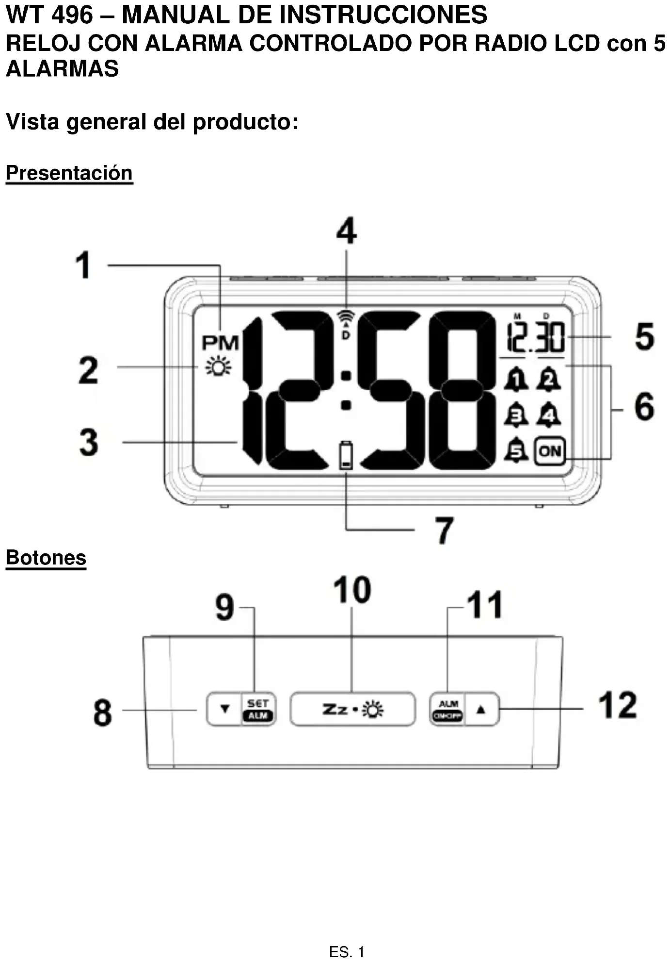 Efectos ambientales en la recepción El reloj obtiene la hora exacta con tecnología inalámbrica. Al igual que todos los dispositivos inalámbricos, las recepción puede verse afectada por las siguientes circunstancias: largas distancias de transmisión proximidad de montañas y valles proximidad de autopistas, vías de tren, aeropuertos, cables de alta tensión, etc. proximidad de edificios en construcción entre edificios altos en el interior de edificios de hormigón proximidad de aparatos eléctricos (PCs, TVs, etc.) y de estructuras metálicas en el interior de vehículos en movimiento Coloque el reloj en una posición donde obtenga una señal óptima, p.ej. cerca de una ventana y lejos de superficies metálicas o aparatos eléctricos. Precauciones Esta unidad está diseñada para usarla solamente en interiores. No someta unidad a fuerzas o golpes excesivos. No exponga la unidad a temperaturas extremas, directa a los rayos del sol, polvo o humedad. No la sumerja en el agua. Evite el contacto con cualquier material corrosivo.ES. 11 No se deshaga de esta unidad arrojándola al fuego ya que puede explotar. No abra la carcasa trasera interior ni manipule ninguno de los componentes de esta unidad. Advertencias de seguridad sobre las baterías Utilizar solamente baterías alcalinas. No utilizar recargables baterías. Coloque las baterías correctamente haciendo coincidir la polaridad (+/-
