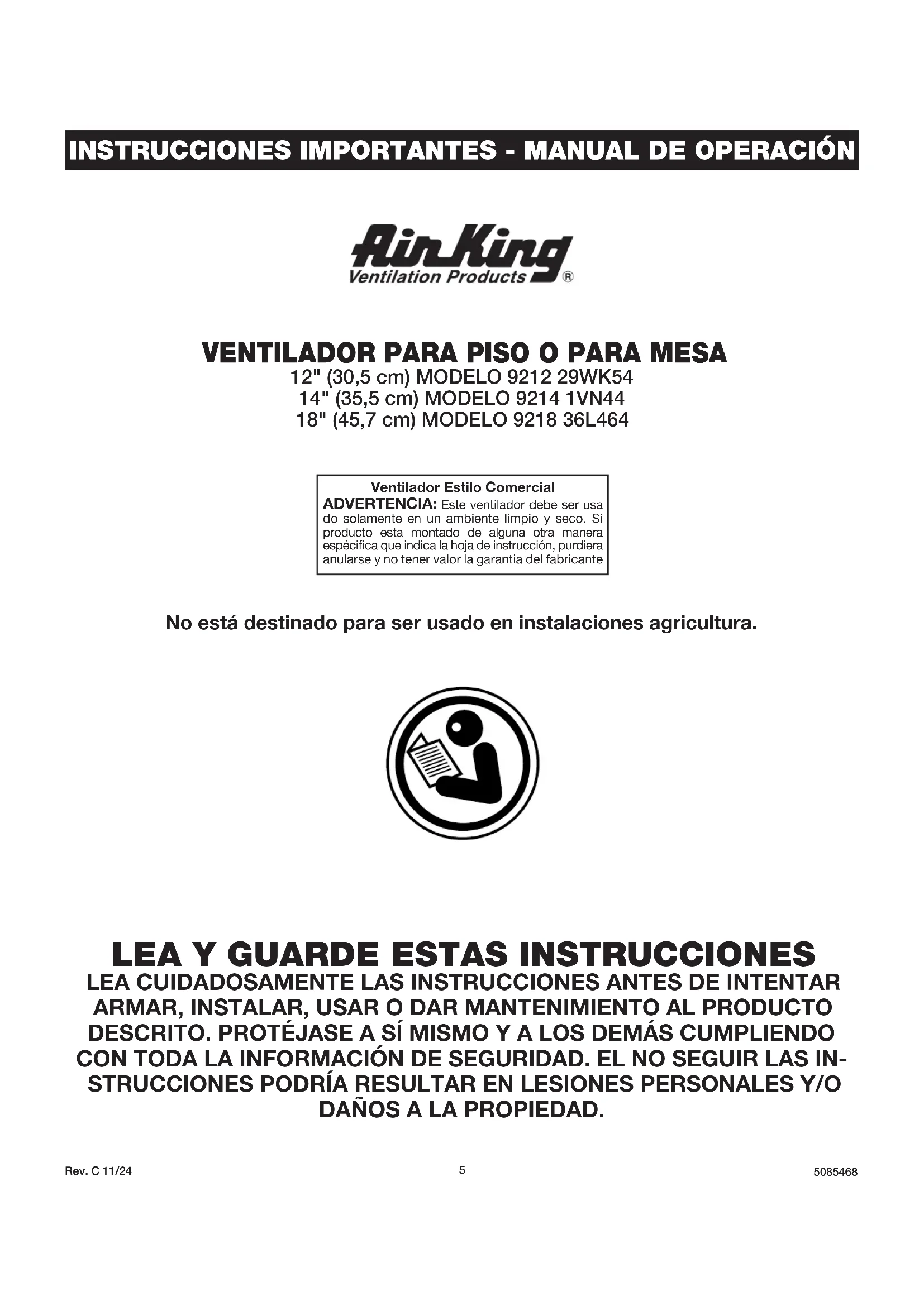 12" (30,5 cm) MODELO 9212 29WK54 14" (35,5 cm) MODELO 9214 1VN44 18" (45,7 cm) MODELO 9218 36L464 No está destinado para ser usado en instalaciones agricultura. Ventilador Estilo ComercialADVERTENCIA: Este ventilador debe ser usa do solamente en un ambiente limpio y seco. Si producto esta montado de alguna otra manera espécica que indica la hoja de instrucción, purdiera anularse y no tener valor la garantia del fabricanteRev. C 11/24
