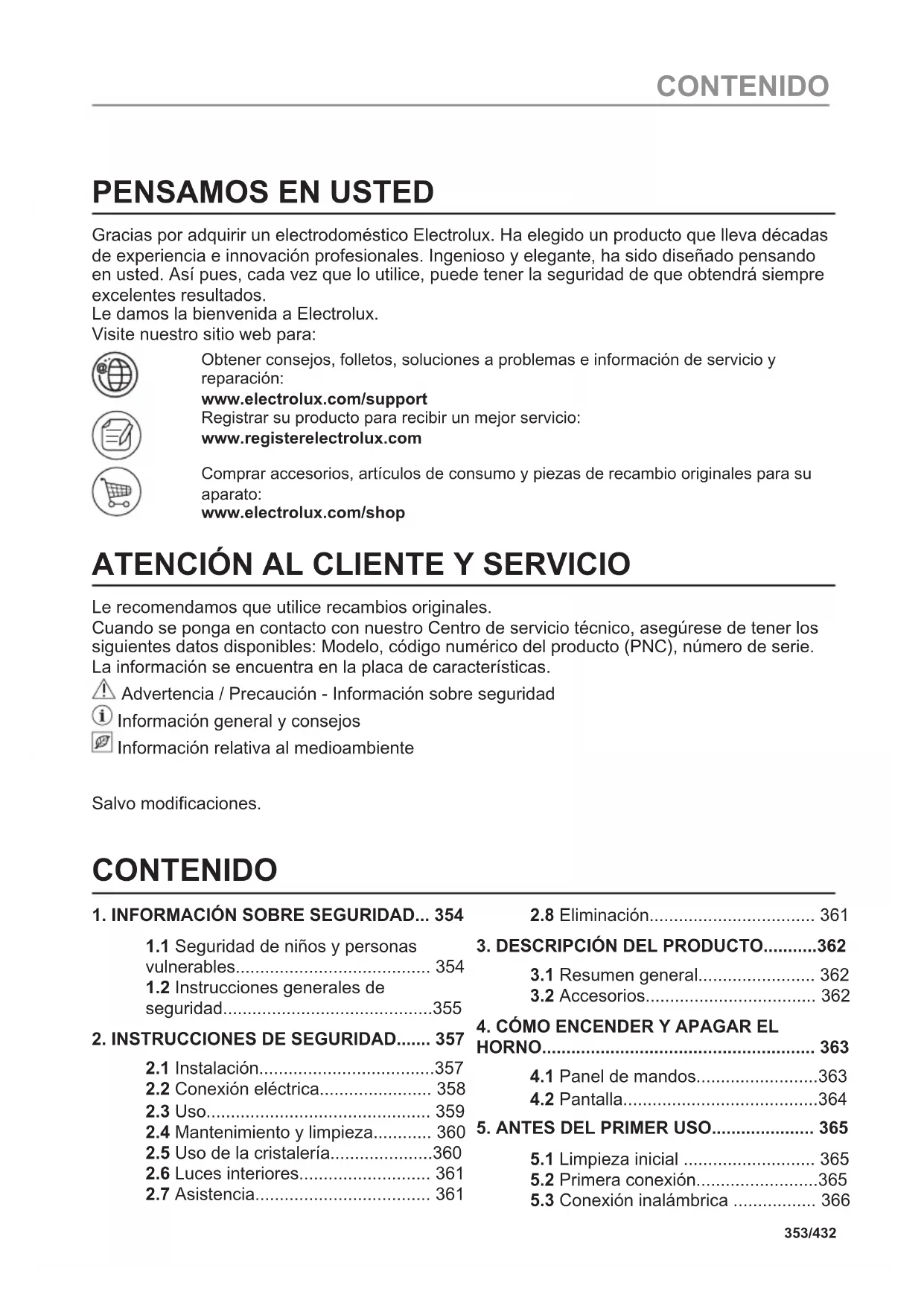 Gracias por adquirir un electrodoméstico Electrolux. Ha elegido un producto que lleva décadas de experiencia e innovación profesionales. Ingenioso y elegante, ha sido diseñado pensando en usted. Así pues, cada vez que lo utilice, puede tener la seguridad de que obtendrá siempre excelentes resultados. Le damos la bienvenida a Electrolux. Visite nuestro sitio web para: Obtener consejos, folletos, soluciones a problemas e información de servicio y reparación: www.electrolux.com/support Registrar su producto para recibir un mejor servicio: www.registerelectrolux.com Comprar accesorios, artículos de consumo y piezas de recambio originales para su aparato: www.electrolux.com/shop