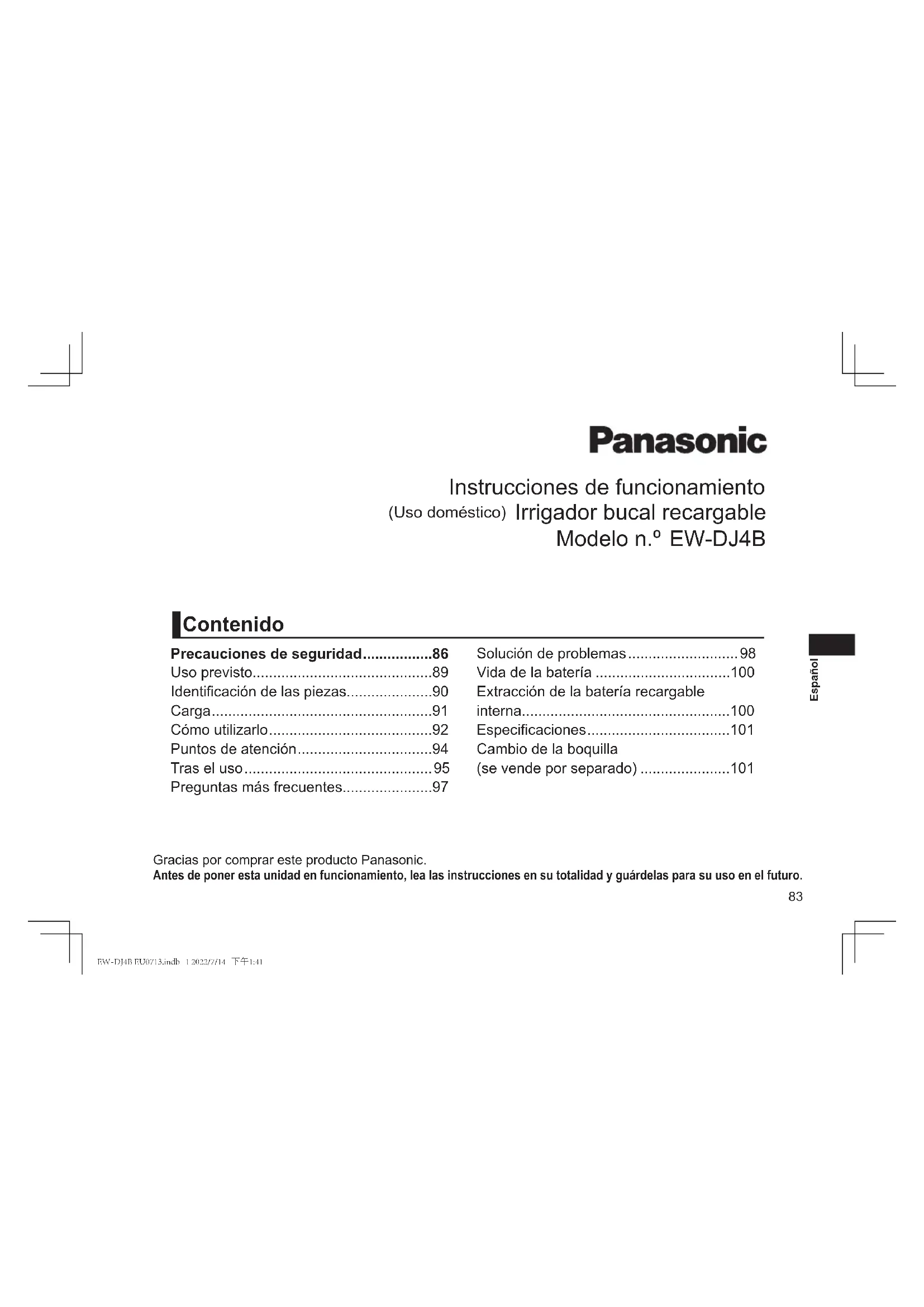 Gracias por comprar este producto Panasonic. Antes de poner esta unidad en funcionamiento, lea las instrucciones en su totalidad y guárdelas para su uso en el futuro. Contenido Instrucciones de funcionamiento (Uso doméstico) Irrigador bucal recargable Modelo n.º EW-DJ4B EW-DJ4B EU0713.indb 1 2022/7/14 下午1:41Español