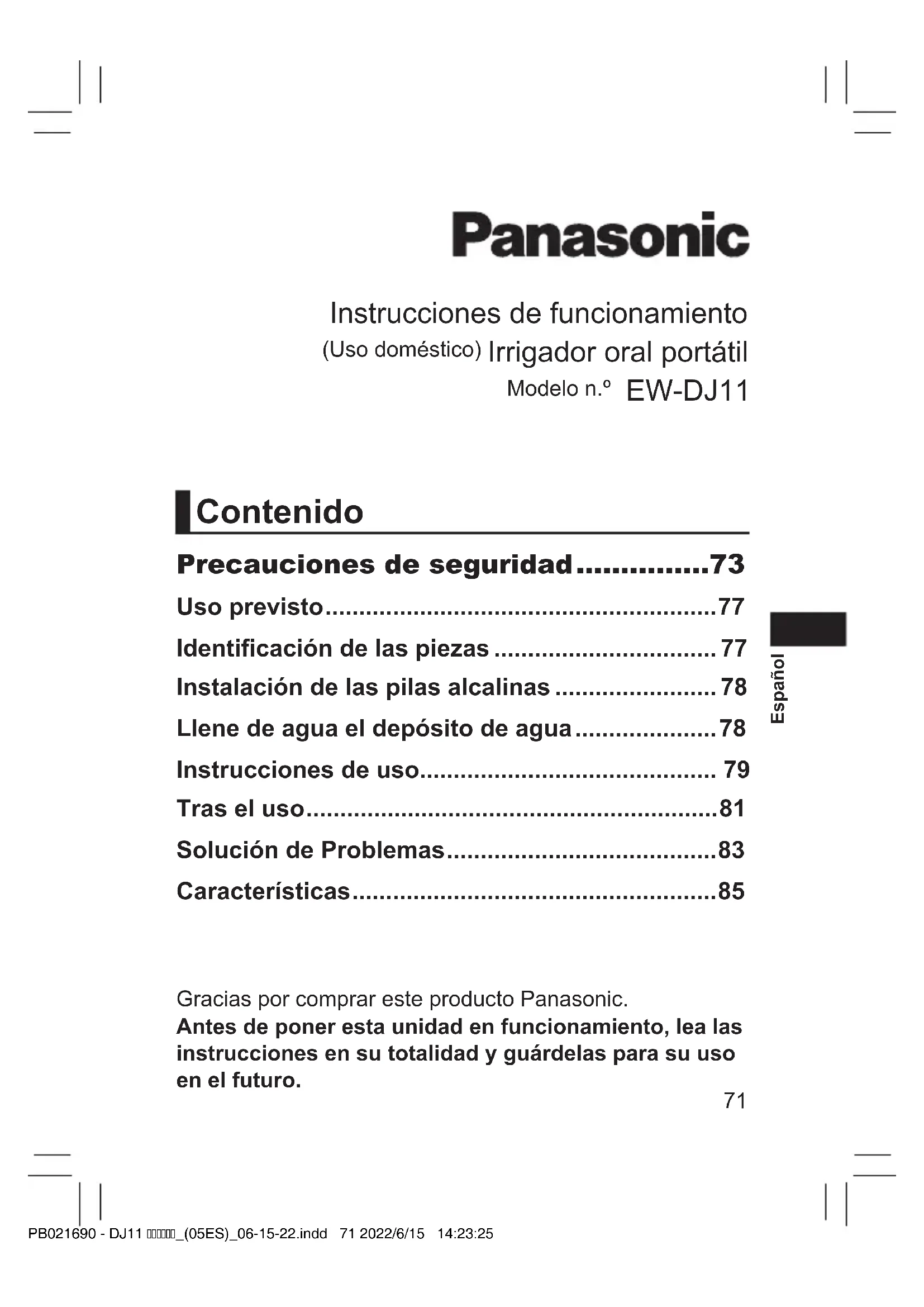 - Empujar PB021690 - DJ11 _(05ES)_06-15-22.indd 84 2022/6/15 14:23:2885 Español Características Fuente de alimentación Pila alcalina Pila Dos LR6 (pilas alcalinas AA) (se venden por separado) Tiempo de funcionamiento Unos 20 minutos aproximadamente (Cuando se utilizan dos pilas alcalinas AA Panasonic LR6, el nivel de presión del agua está en 2 y la temperatura ambiente es de 20 ºC) Volumen del depósito Aproximadamente 150 mL (Durante unos 35 segundos aproximadamente del funcionamiento cuando el nivel de presión de agua está establecido en el 2) Medidas Aproximadamente 30,9 cm (o 23,4 cm cuando la boquilla no está instalada) (Al.) x 5,0 cm ((An.) x 5,7 cm (Prof.) En almacenamiento: Aproximadamente 15,4 cm (Al.) x 5,2 cm (An.) x 5,7 cm (Prof.) Ruido Acústico Aéreo 72 (dB (A) re 1 pW) Este producto está destinado solamente para su uso doméstico. PB021690 - DJ11 _(05ES)_06-15-22.indd 85 2022/6/15 14:23:2886 Español Eliminación de Aparatos Viejos Solamente para la Unión Europea y países con sistemas de reciclado. Este símbolo en los productos, su embalaje o enlosdocumentosquelosacompañensignica que los productos eléctricos y electrónicos usadas no deben mezclarse con los residuos domésticos. Para el adecuado tratamiento, recuperación y reciclaje de los productos viejos llévelos a los puntos de recogida de acuerdo con su legislación nacional. Si los elimina correctamente ayudará a preservar valiosos recursos y evitará potenciales efectos negativos sobre la salud de las personas y sobre el medio ambiente. Para más información sobre la recogida u reciclaje, por favor contacte con su ayuntamiento. Puede haber sanciones por una incorrecta eliminación de este residuo, de acuerdo con la legislación nacional. Importador: Panasonic Marketing Europe GmbH Representante Autorizado para la UE: Panasonic Testing Centre Winsbergring 15, 22525 Hamburgo, Alemania Fabricado por: Panasonic Corporation 1006, Oaza Kadoma, Ciudad de Kadoma, Osaka, Japón PB021690 - DJ11 _(05ES)_06-15-22.indd 86 2022/6/15 14:23:2887 Nederlands Hartelijk dank voor uw aankoop van dit Panasonic-product. Lees voor gebruik van dit apparaat deze instructies en bewaar ze om ze later te raadplegen. Gebruiksaanwijzing (Huishoudelijk gebruik) Draagbaar mondspoelapparaat Model Nr. EW-DJ11 Inhoud Veiligheidsmaatregelen p. 89