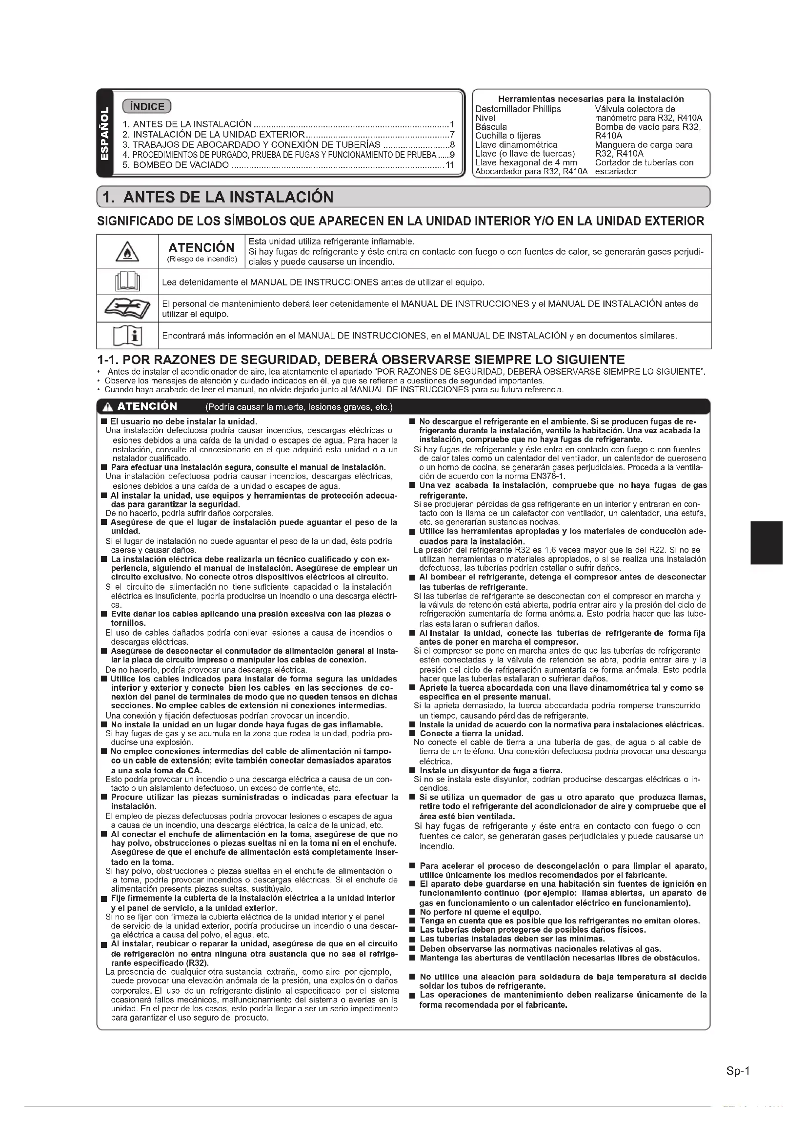 Las operaciones de mantenimiento deben realizarse únicamente de la forma recomendada por el fabricante. Herramientas necesarias para la instalación Destornillador Phillips Nivel Báscula Cuchilla o tijeras Llave dinamométrica Llave (o llave de tuercas) Llave hexagonal de 4 mm Abocardador para R32, R410A Válvula colectora de manómetro para R32, R410A Bomba de vacío para R32, R410A Manguera de carga para R32, R410A Cortador de tuberías con escariador ESPAÑOL ATENCIÓN (Podría causar la muerte, lesiones graves, etc.) 1-1. POR RAZONES DE SEGURIDAD, DEBERÁ OBSERVARSE SIEMPRE LO SIGUIENTE