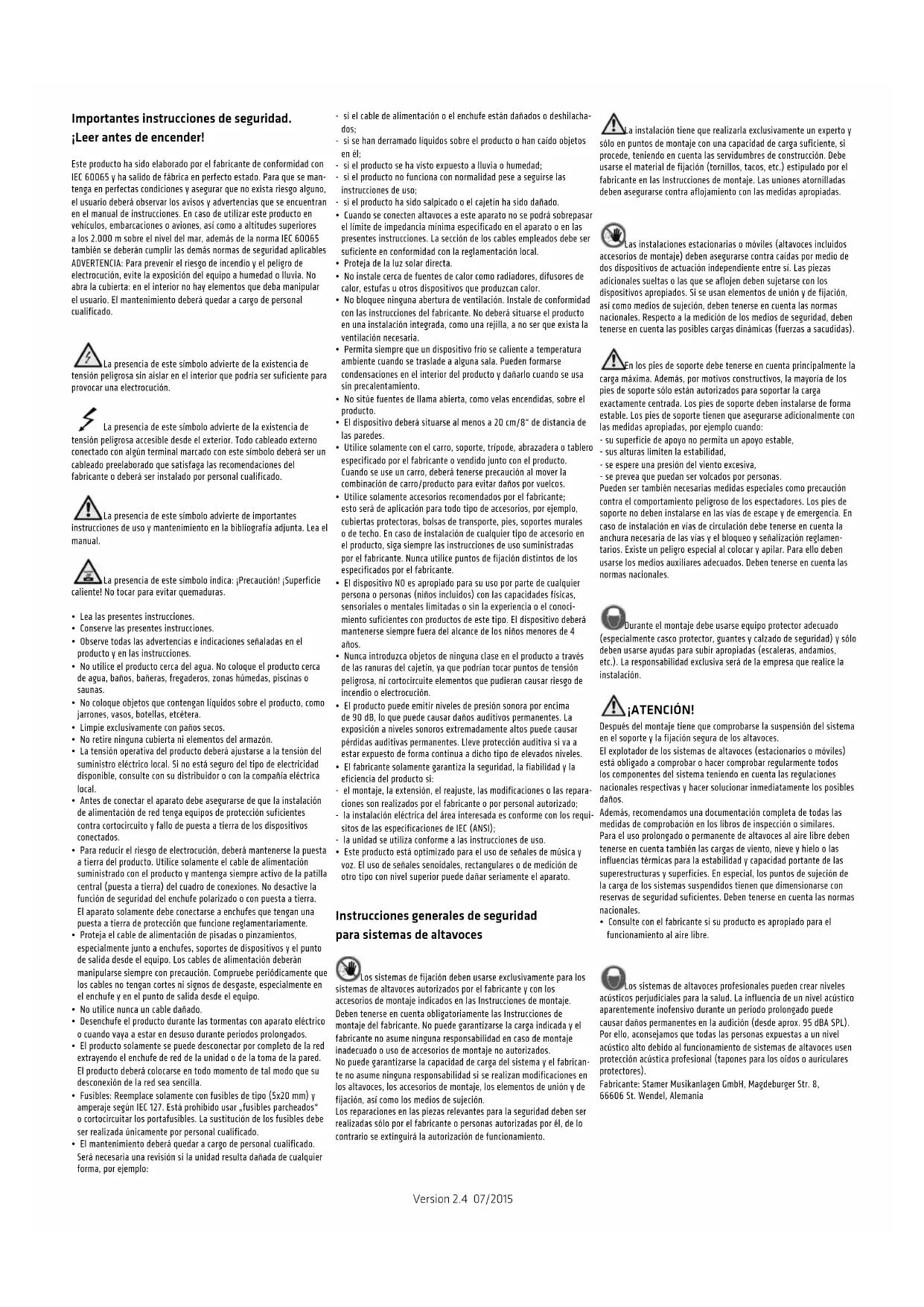 - Este producto está optimizado para el uso de señales de música y voz. El uso de señales senoidales, rectangulares o de medición de otro tipo con nivel superior puede dañar seriamente el aparato. Instrucciones generales de seguridad para sistemas de altavoces Los sistemas de fijación deben usarse exclusivamente para los sistemas de altavoces autorizados por el fabricante y con los accesorios de montaje indicados en las Instrucciones de montaje. Deben tenerse en cuenta obligatoriamente las Instrucciones de montaje del fabricante. No puede garantizarse la carga indicada y el fabricante no asume ninguna responsabilidad en caso de montaje inadecuado o uso de accesorios de montaje no autorizados. No puede garantizarse la capacidad de carga del sistema y el fabrican- te no asume ninguna responsabilidad si se realizan modificaciones en los altavoces, los accesorios de montaje, los elementos de unión y de fijación, así como los medios de sujeción. Los reparaciones en las piezas relevantes para la seguridad deben ser realizadas sólo por el fabricante o personas autorizadas por él, de lo contrario se extinguirá la autorización de funcionamiento. La instalación tiene que realizarla exclusivamente un experto y sólo en puntos de montaje con una capacidad de carga suficiente, si procede, teniendo en cuenta las servidumbres de construcción. Debe usarse el material de fijación (tornillos, tacos, etc.) estipulado por el fabricante en las Instrucciones de montaje. Las uniones atornilladas deben asegurarse contra aflojamiento con las medidas apropiadas. Las instalaciones estacionarias o móviles (altavoces incluidos accesorios de montaje) deben asegurarse contra caídas por medio de dos dispositivos de actuación independiente entre sí. Las piezas adicionales sueltas o las que se aflojen deben sujetarse con los dispositivos apropiados. Si se usan elementos de unión y de fijación, así como medios de sujeción, deben tenerse en cuenta las normas nacionales. Respecto a la medición de los medios de seguridad, deben tenerse en cuenta las posibles cargas dinámicas (fuerzas a sacudidas). En los pies de soporte debe tenerse en cuenta principalmente la carga máxima. Además, por motivos constructivos, la mayoría de los pies de soporte sólo están autorizados para soportar la carga exactamente centrada. Los pies de soporte deben instalarse de forma estable. Los pies de soporte tienen que asegurarse adicionalmente con las medidas apropiadas, por ejemplo cuando: - su superficie de apoyo no permita un apoyo estable, - sus alturas limiten la estabilidad, - se espere una presión del viento excesiva, - se prevea que puedan ser volcados por personas. Pueden ser también necesarias medidas especiales como precaución contra el comportamiento peligroso de los espectadores. Los pies de soporte no deben instalarse en las vías de escape y de emergencia. En caso de instalación en vías de circulación debe tenerse en cuenta la anchura necesaria de las vías y el bloqueo y señalización reglamen- tarios. Existe un peligro especial al colocar y apilar. Para ello deben usarse los medios auxiliares adecuados. Deben tenerse en cuenta las normas nacionales. Durante el montaje debe usarse equipo protector adecuado (especialmente casco protector, guantes y calzado de seguridad) y sólo deben usarse ayudas para subir apropiadas (escaleras, andamios, etc.). La responsabilidad exclusiva será de la empresa que realice la instalación. ¡ATENCIÓN! Después del montaje tiene que comprobarse la suspensión del sistema en el soporte y la fijación segura de los altavoces. El explotador de los sistemas de altavoces (estacionarios o móviles) está obligado a comprobar o hacer comprobar regularmente todos los componentes del sistema teniendo en cuenta las regulaciones nacionales respectivas y hacer solucionar inmediatamente los posibles daños. Además, recomendamos una documentación completa de todas las medidas de comprobación en los libros de inspección o similares. Para el uso prolongado o permanente de altavoces al aire libre deben tenerse en cuenta también las cargas de viento, nieve y hielo o las influencias térmicas para la estabilidad y capacidad portante de las superestructuras y superficies. En especial, los puntos de sujeción de la carga de los sistemas suspendidos tienen que dimensionarse con reservas de seguridad suficientes. Deben tenerse en cuenta las normas nacionales.
