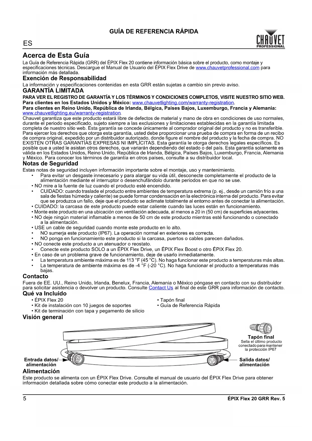 ÉPIX Flex 20 GRR Rev. 5 Acerca de Esta Guía La Guía de Referencia Rápida (GRR) del ÉPIX Flex 20 contiene información básica sobre el producto, como montaje y especificaciones técnicas . Descargue el Manual de Usuario del ÉPIX Flex Drive de www.chauvetprofessional.com para información más detallada. Exención de Responsabilidad La información y especificaciones contenidas en esta GRR están sujetas a cambio sin previo aviso.