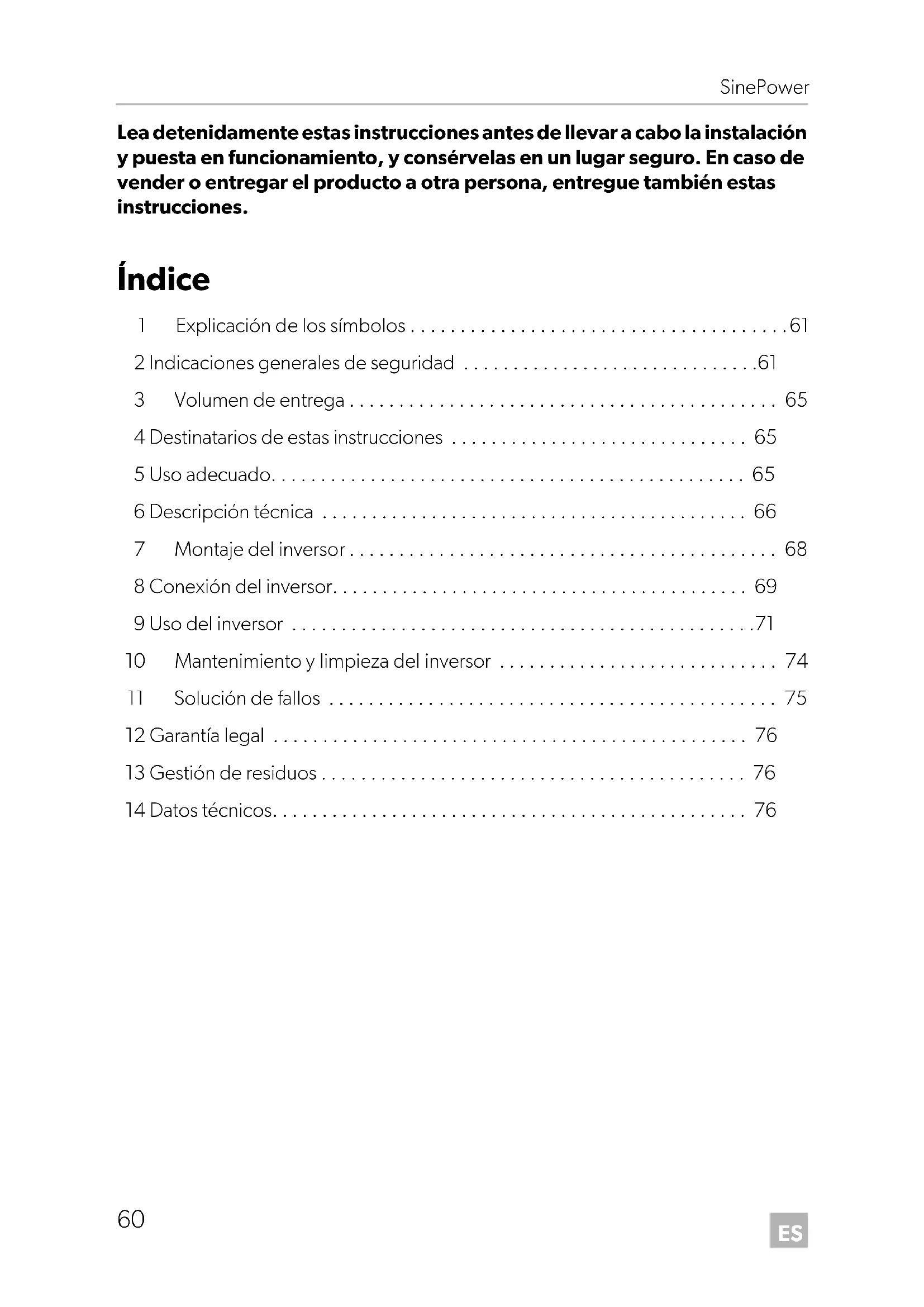 - Lea detenidamente estas instrucciones antes de llevar a cabo la instalación y puesta en funcionamiento, y consérvelas en un lugar seguro. En caso de vender o entregar el producto a otra persona, entregue también estas instrucciones. Índice 1 Explicación de los símbolos p. 61