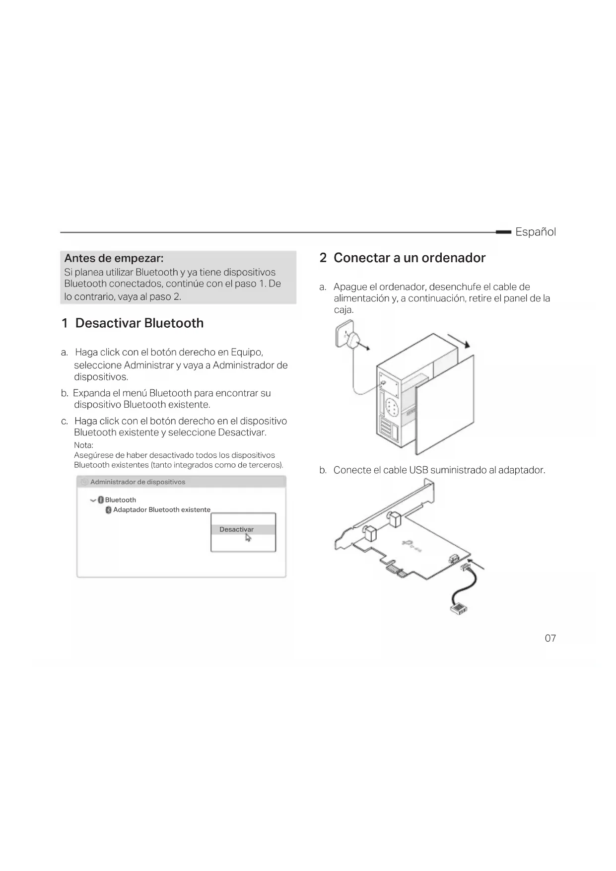 - Bluetooth: Haga clickk en y siga las c. Localice una ranura PCIE X1 disponible e inserte cuidadosamente el adaptador. Nota: Si el soporte no es adecuado para su ordenador, separe el soporte de la placa del adaptador y cámbielo por el soporte de perl bajo. d. Localice un conector F_USB disponible y conecte cuidadosamente el cable USB. USB09 Español instrucciones en pantalla para completar la instalación Bluetooth. 4 Unirse a una red inalámbrica a. Haga clickk en el icono de red ( o ) en la barra de tareas. b. Seleccione su red Wi-Fi, haga clickk en Conectar e introduzca la contraseña cuando el sistema la solicite. 5 Emparejar con dispositivos Bluetooth a. Haga clickk con el botón derecho en el (Bluetooth) de la barra de tareas. Si no se muestra, puede activarlo primero pulsando aquí b. Selecciona Agregar un dispositivo Bluetooth o Agregar un dispositivo para buscar dispositivos disponibles. c. Seleccione su dispositivo Bluetooth de la lista y siga las instrucciones en pantalla para completar el emparejamiento. Nota: Asegúrese de que el Bluetooth de su dispositivo esté habilitado y visible.Eλληνικά