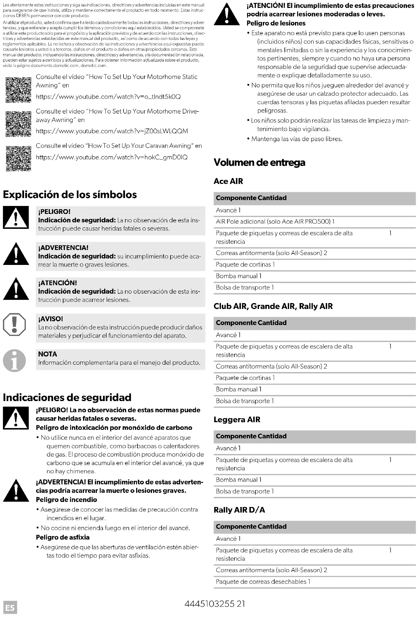 - Mantenga las vías de paso libres. Volumen de entrega Ace AIR Club AIR, Grande AIR, Rally AIR Leggera AIR Rally AIR D/A Consulte el vídeo “How To Set Up Your Motorhome Static Awning” en https://www.youtube.com/watch?v=o_tIndt5k0Q Consulte el vídeo “How To Set Up Your Motorhome Drive- away Awning” en https://www.youtube.com/watch?v=jZ00sLWLQQM Consulte el vídeo “How To Set Up Your Caravan Awning” en https://www.youtube.com/watch?v=hokC_gmD0lQ ¡PELIGRO! Indicación de seguridad: La no observación de esta ins- trucción puede causar heridas fatales o severas. ¡ADVERTENCIA! Indicación de seguridad: su incumplimiento puede aca- rrear la muerte o graves lesiones. ¡ATENCIÓN! Indicación de seguridad: La no observación de esta ins- trucción puede acarrear lesiones. ¡AVISO! La no observación de esta instrucción puede producir daños materiales y perjudicar el funcionamiento del aparato. NOTA Información complementaria para el manejo del producto. Componente Cantidad Avancé 1 AIR Pole adicional (solo Ace AIR PRO500) 1 Paquete de piquetas y correas de escalera de alta resistencia