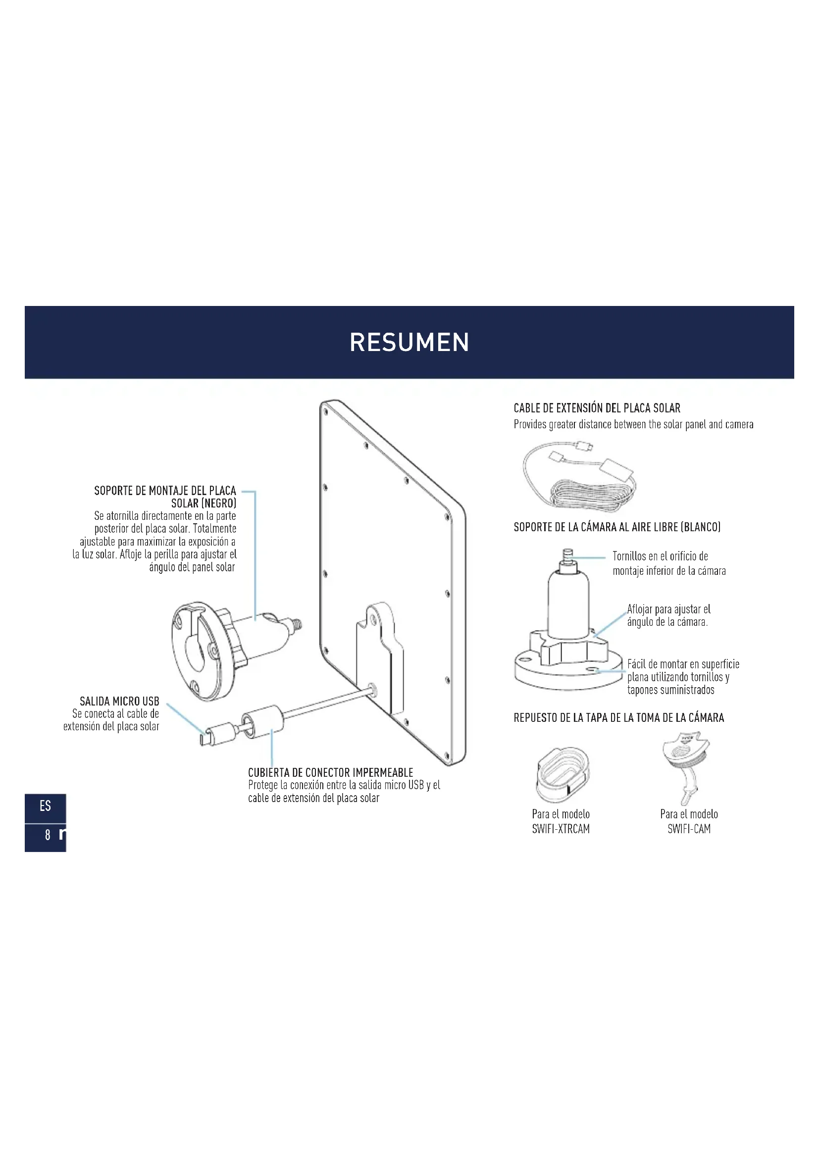 Protege la conexión entre la salida micro USB y el cable de extensión del placa solar CABLE DE EXTENSIÓN DEL PLACA SOLAR Provides greater distance between the solar panel and camera Para el modelo SWIFI-CAM Tornillos en el orificio de montaje inferior de la cámara Aflojar para ajustar el ángulo de la cámara. Fácil de montar en superficie plana utilizando tornillos y tapones suministrados Para el modelo SWIFI-XTRCAM9
