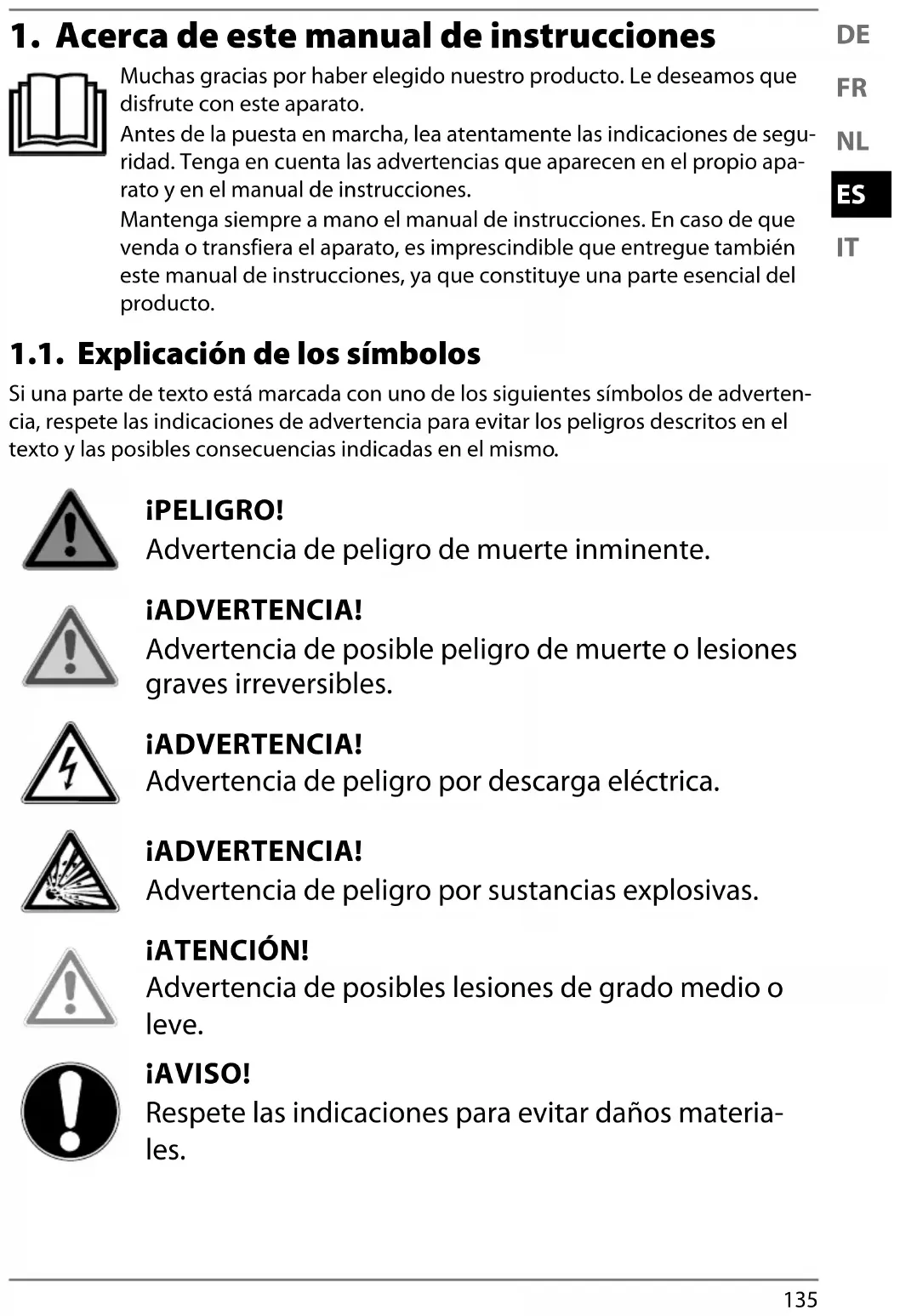 Muchas gracias por haber elegido nuestro producto. Le deseamos que disfrute con este aparato. Antes de la puesta en marcha, lea atentamente las indicaciones de segu- ridad. Tenga en cuenta las advertencias que aparecen en el propio apa- rato y en el manual de instrucciones. Mantenga siempre a mano el manual de instrucciones. En caso de que venda o transfiera el aparato, es imprescindible que entregue también este manual de instrucciones, ya que constituye una parte esencial del producto. 1.1. Explicación de los símbolos Si una parte de texto está marcada con uno de los siguientes símbolos de adverten-Si una parte de texto está marcada con uno de los siguientes símbolos de adverten- cia, respete las indicaciones de advertencia para evitar los peligros descritos en el cia, respete las indicaciones de advertencia para evitar los peligros descritos en el texto y las posibles consecuencias indicadas en el mismo. texto y las posibles consecuencias indicadas en el mismo. ¡PELIGRO! Advertencia de peligro de muerte inminente. ¡ADVERTENCIA! Advertencia de posible peligro de muerte o lesiones graves irreversibles. ¡ADVERTENCIA! Advertencia de peligro por descarga eléctrica. ¡ADVERTENCIA! Advertencia de peligro por sustancias explosivas. ¡ATENCIÓN! Advertencia de posibles lesiones de grado medio o leve. ¡AVISO! Respete las indicaciones para evitar daños materia- les. 20040 ML DS 5006 8666 Content Final.indb 13520040 ML DS 5006 8666 Content Final.indb 135 26.11.2021 09:11:1726.11.2021 09:11:17136 Información más detallada para el uso del aparato. ¡AVISO! Respete las indicaciones del manual de instrucciones.